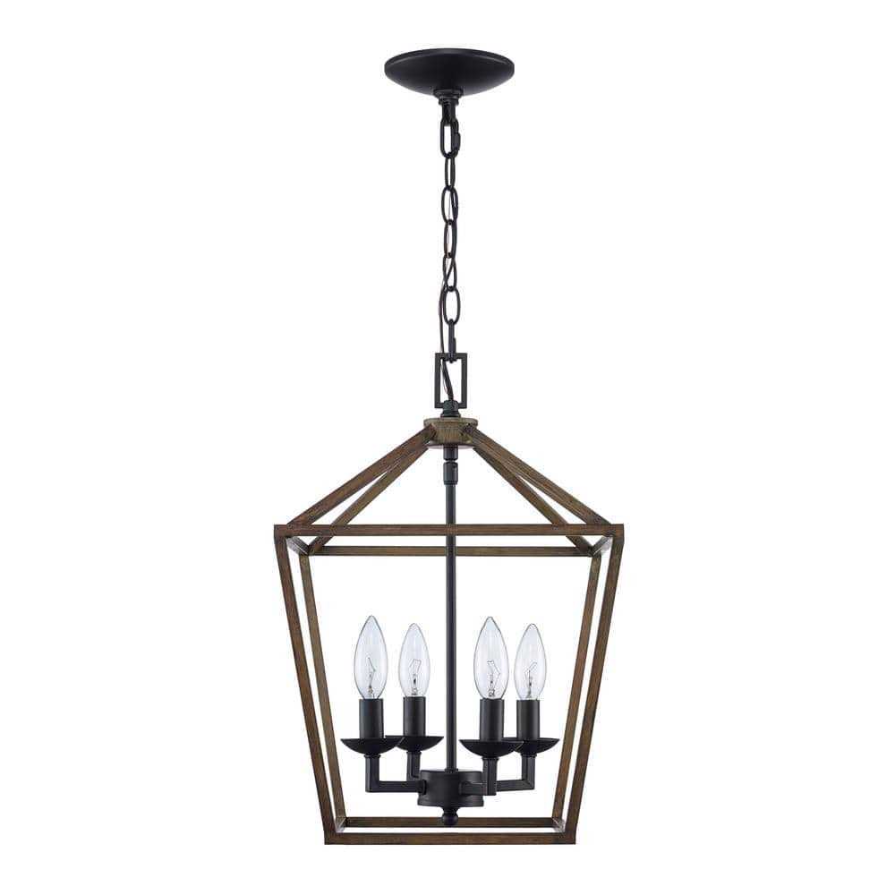 The Weyburn Collection exhibits farmhouse style indoor lighting with rustic, industrial appeal. Enhance your entryway, kitchen or dining room with the classic styling of this 4-light chandelier. Highlighted by a black finish and a contemporary faux-wood metal birdcage, this fixture adds a warm glow to a variety of indoor spaces. The open caged shade exposes the candelabra style bulbs for a classic look, perfect for providing ample task lighting. This adjustable chandelier is mounted with a matching ceiling canopy and includes 5 ft. of chain for a customizable suspension height. Farmhouse chandelier with a brown, faux wood shade Includes 60 in. chain for adjustable hanging height from 20 in. up to 79 in. Round ceiling plate measures 5 in.