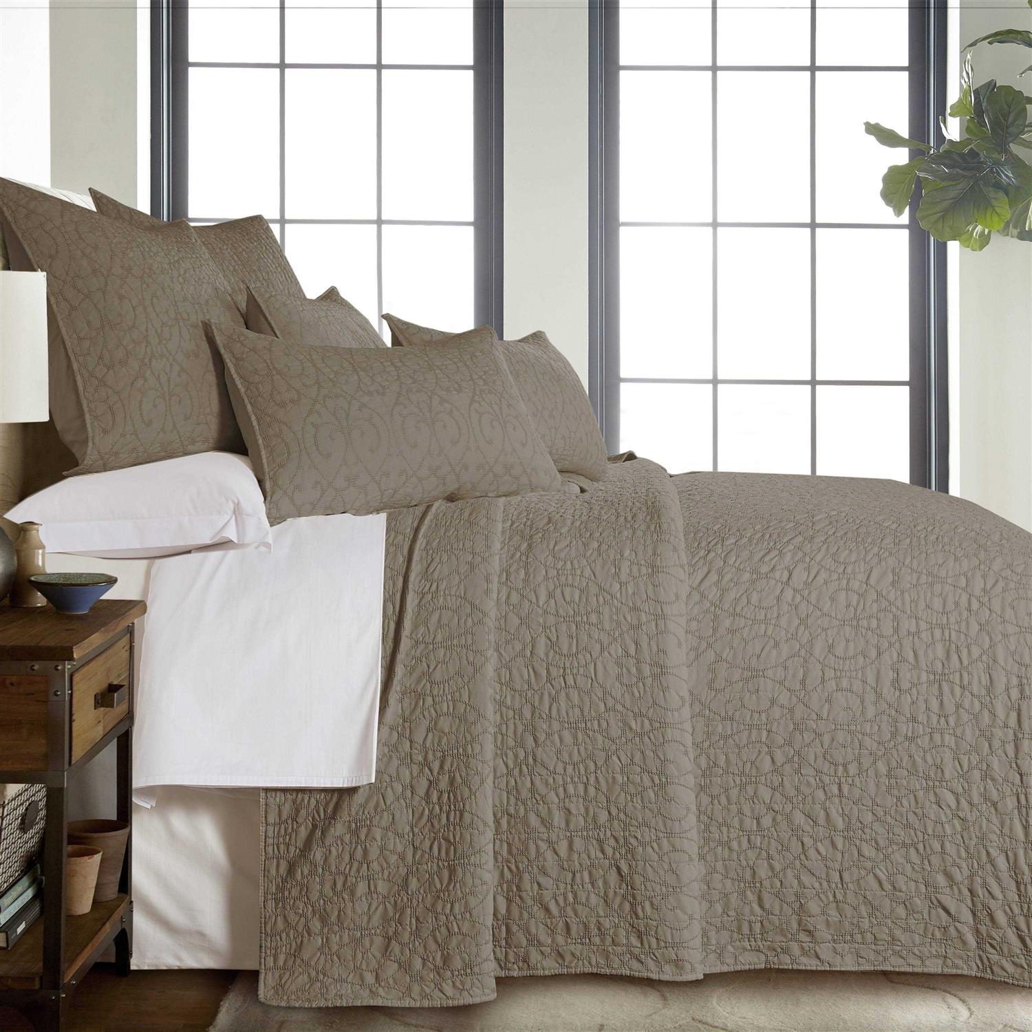 The Marta King quilted bedspread set by Homthreads is inspired by traditional jacquards. Offered in this perfect shade of Taupe, this design will immediately transform your bedroom. Made with the softest lightweight pre-washed microfiber, this bedspread is made from a microfiber damask scroll on the one side, reversing to a solid microfiber in the same color on the other. The King Bedspread Set is machine washable and includes the bedspread (120 x 118 in.) and one standard pillow sham (36 x 20 in.) Enjoy this for years to come!