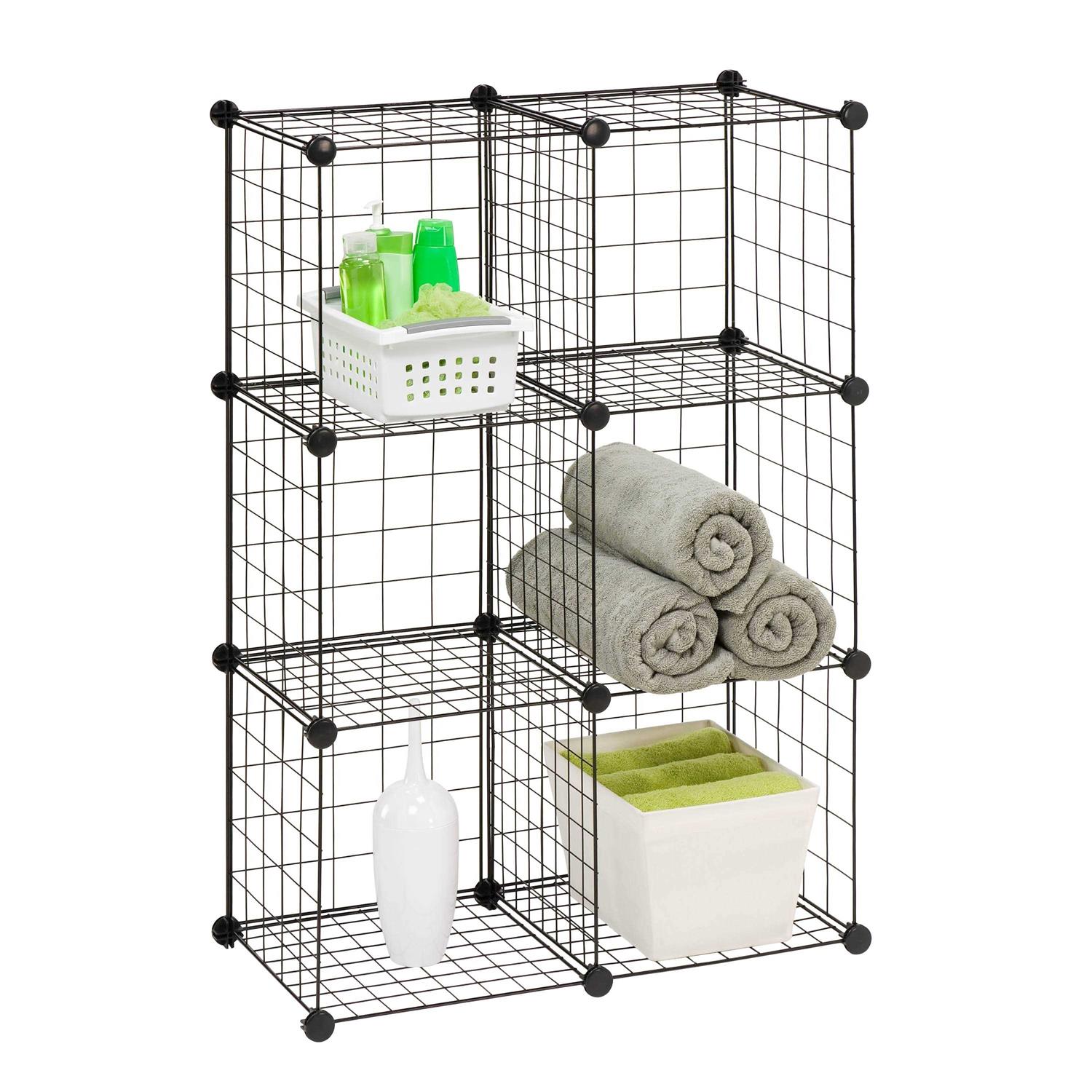 Unlimited configurations Heavy gauge steel wire Multi-angle connectors Dimensions: 29” L x 14.5” W x 43” H Individual Cube: 14″ x 14″ SHF-09484 Create unlimited configurations or combine multiple storage cubes to build a customized storage solution. Easy snap together assembly is achieved with multi-angle and heavy duty composite connectors. Made from heavy gauge steel wire, this organization unit is perfect for bedrooms, bathrooms, laundry areas, dorms, and the garage.