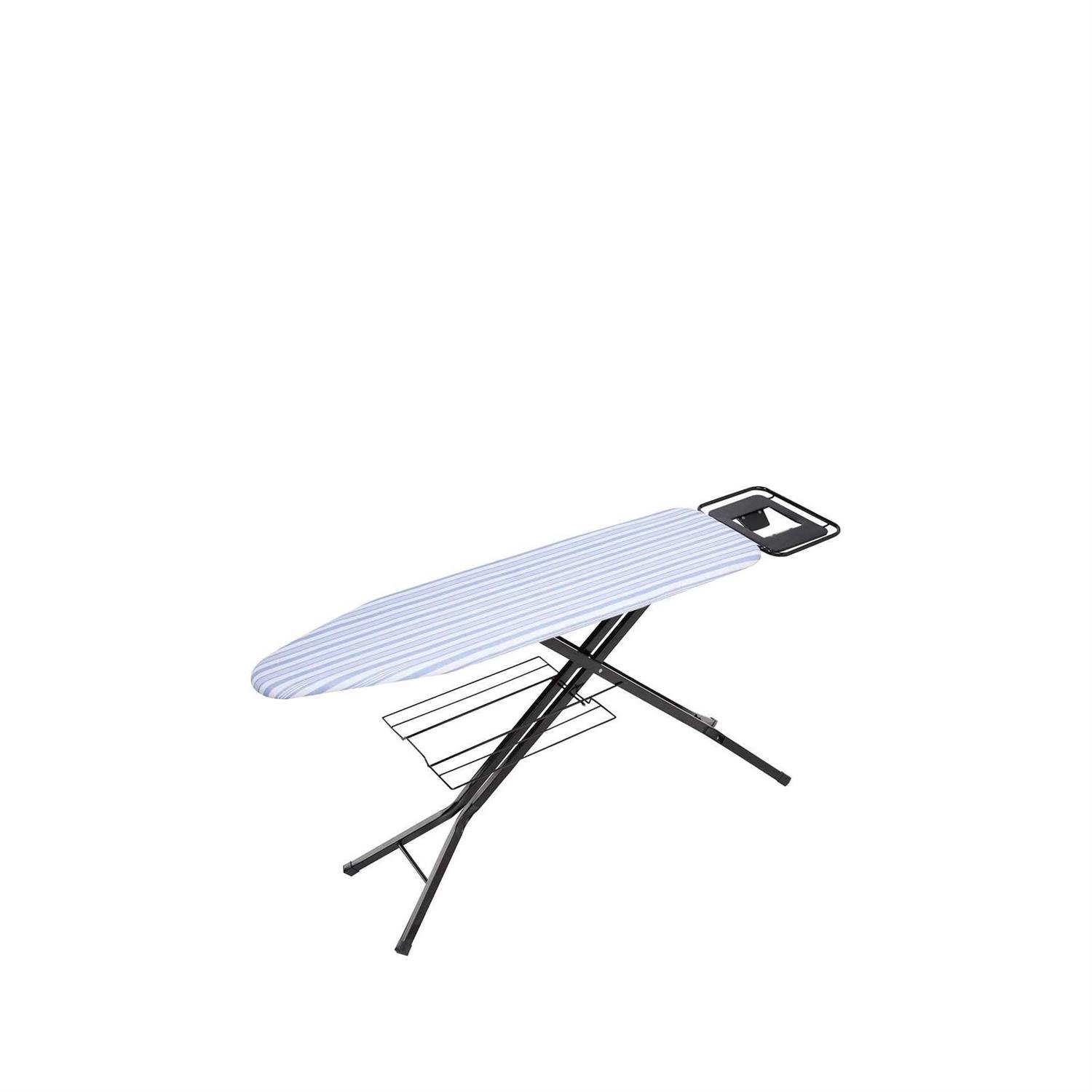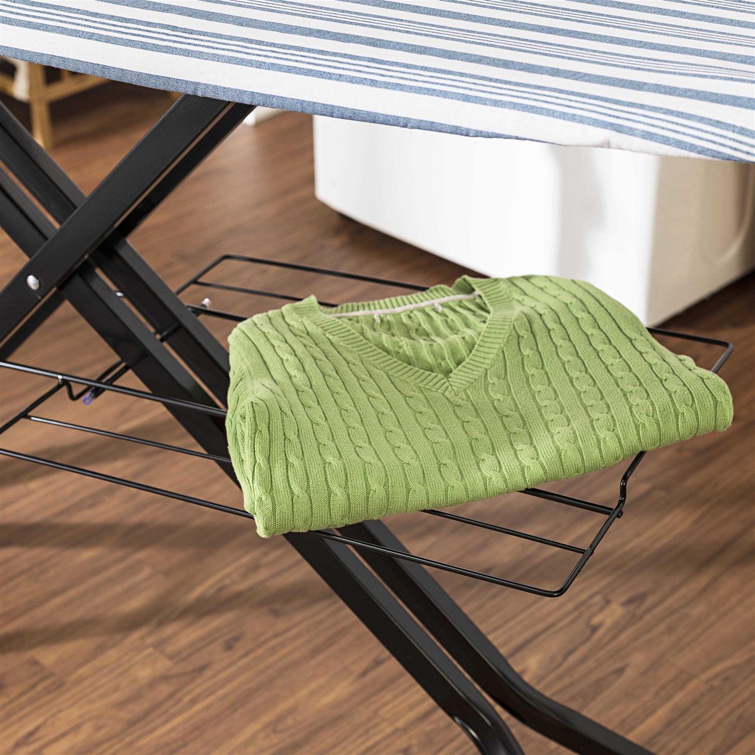 Quad-Leg Ironing Board with Iron Rest – Classic styling and modern conveniences combine in this sturdy quad-leg ironing board.An integrated iron rest is the perfect spot to rest a warm iron and prevent scorching. The powder-coated steel frame offers 7-levels of adjustable height and incorporates a safety lock device for comfortable ironing. A convenient lower sweater shelf is perfect for temporary storage of folded items. A 100% cotton cover in blue and white stripes includes a felt pad for a smooth ironing surface every time. Assembly Required.