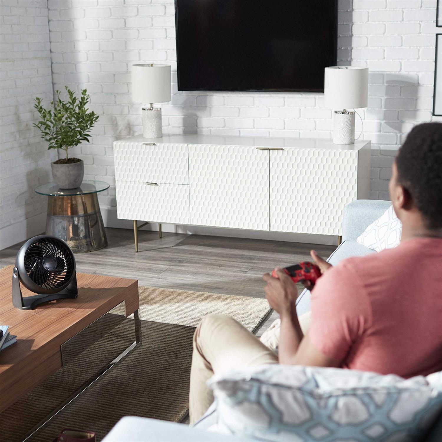 Aerodynamic TurboForce design for maximum air movement. Use for intense personal cooling or energy-saving air circulation. 25% quieter than similar models. Can be used on table or mounted to wall for convenience. Head pivots 90 degrees with 3 speeds and 7 inch blade.