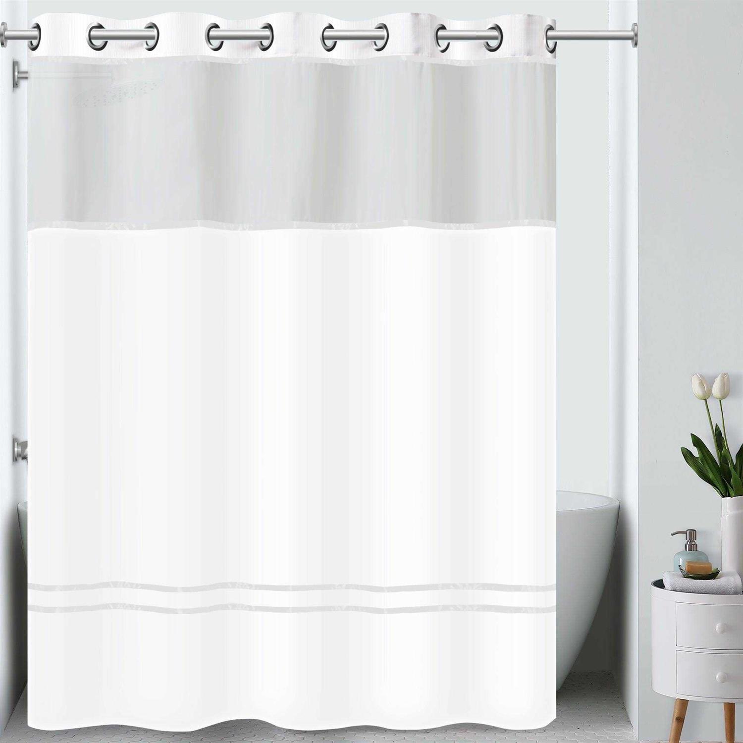 The innovative Hookless Escape Fabric Shower Curtain offers no hassles thanks to their split ring hookless design that lets you hang them in less than 10 seconds. Features100% polyester Machine wash Features elegant ribbon detail and a translucent window. DescriptionThe innovative Hookless Escape Fabric Shower Curtain offers no hassles thanks to their split ring hookless design that lets you hang them in less than 10 seconds.