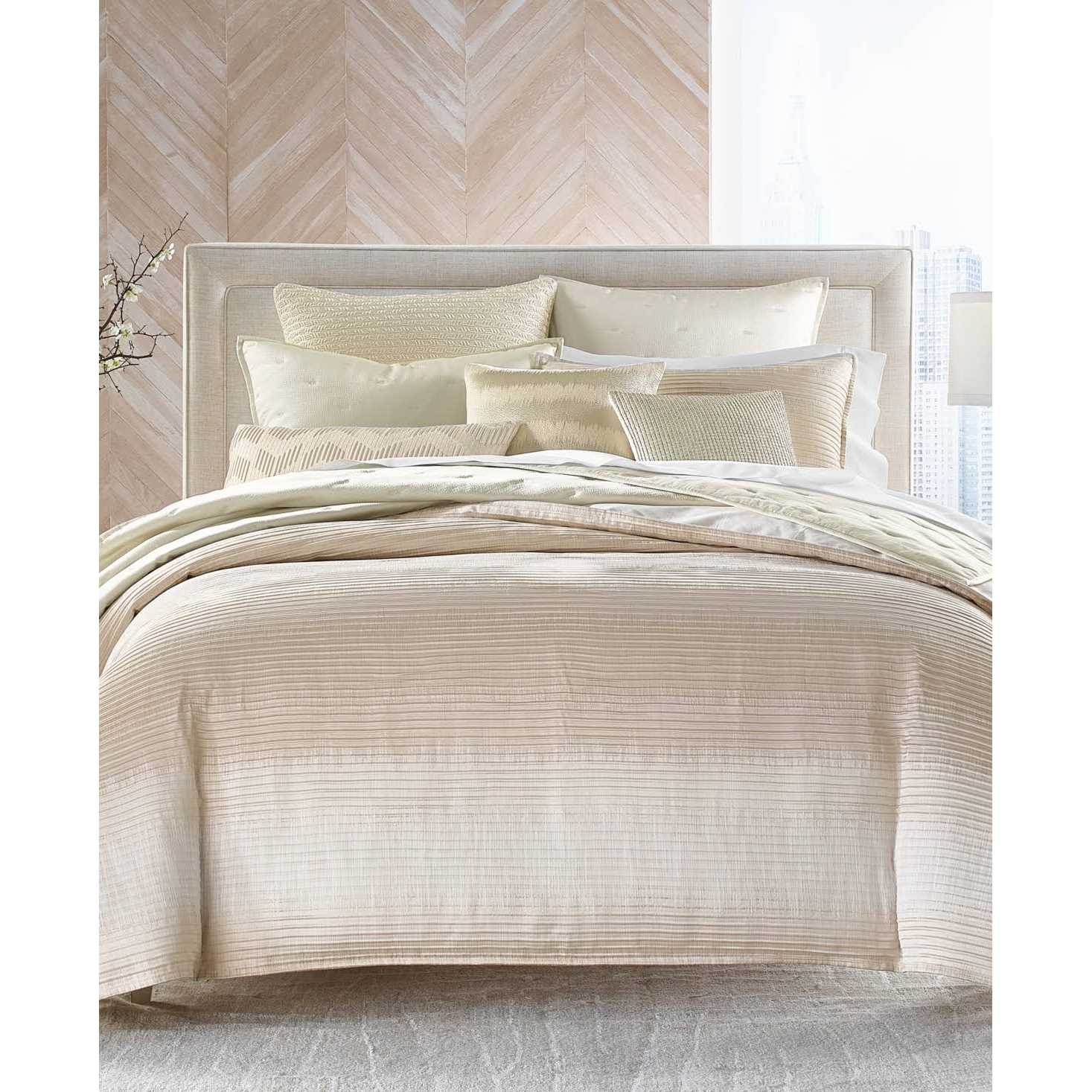 Step into serenity with Ikat Stripe bedding collection. The design is a subtle stripe with a sophisticated ikat effect, reminiscent of scenic sand dunes. The jacquard construction is a textural ottoman weave that adds dimension to fabric. The tones of ivory and sand add warmth to any bedroom. Style Keywords: Neutral,King,Jacquard,Polyester,Zipper,Cotton,Ombre,Contemporary,Light,Duvet,Ribbed,Goose Down