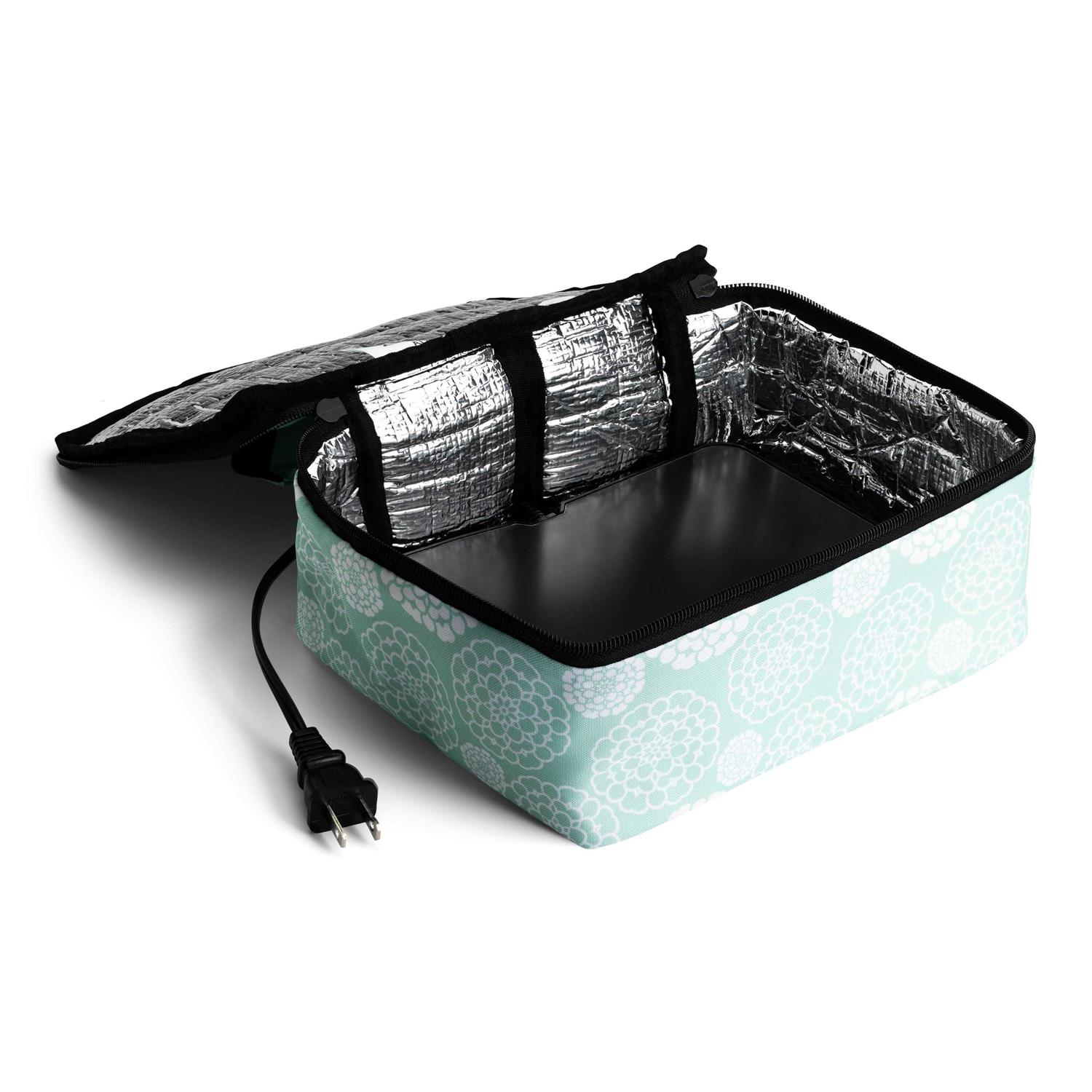 Portable and convenient food storage container warms and reheats food without the use of a microwave for delicious leftovers. Evenly cooks or reheats fresh or frozen meals and dishes in about an hour without burning or drying out your food. Compatible with most flat-bottom, sealable containers including glass, plastic, Tupperware, metal, aluminum, foil, and cardboard. Accommodates containers up to 6.75 inches long by 8.75 inches wide by 2.5 inches high or 1.50 quarts of food. Requires no monitoring, just place your meal inside, plug it in, and go about your day and enjoy your meal when you are ready. Material: Polyester.
