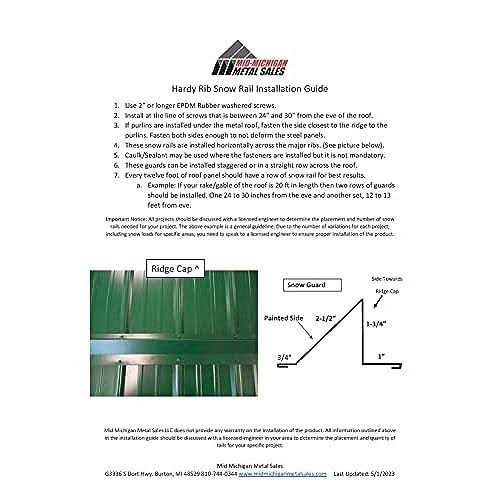 Manufactured in USA 80 feet of Metal snow rails per carton. (20 pcs 4 foot long) Includes 1 bag of 2″ (250 pcs) color matched screws per carton 29 gauge AZ50 Galvalume Steel Made for Exposed Fastener Metal Roofs Color swatches/samples can be purchased by searching for B0BF16GRSJ in the search bar and selecting the color you require.