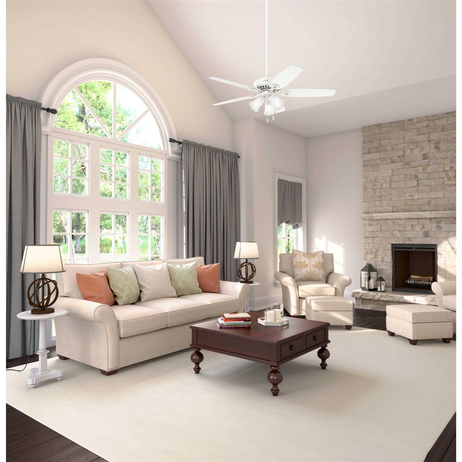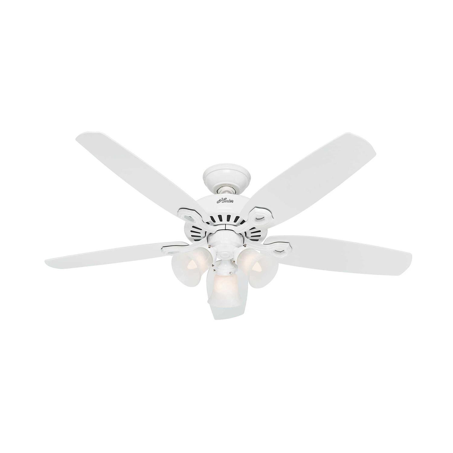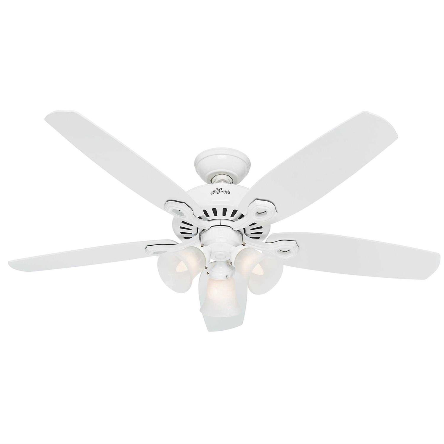 Builder Plus combines 19th century craftsmanship with 21st century design and technology to create ceiling fans of unmatched quality, style, and whisper-quiet performance. Using the finest materials to create stylish designs, Hunter ceiling fans work bea. White with 5 bleached oak/white blades. Frosted glass. Whisperwind mode. 3-position mounting system. 12″ blade pitch. Includes three 60W candelebra bulbs.