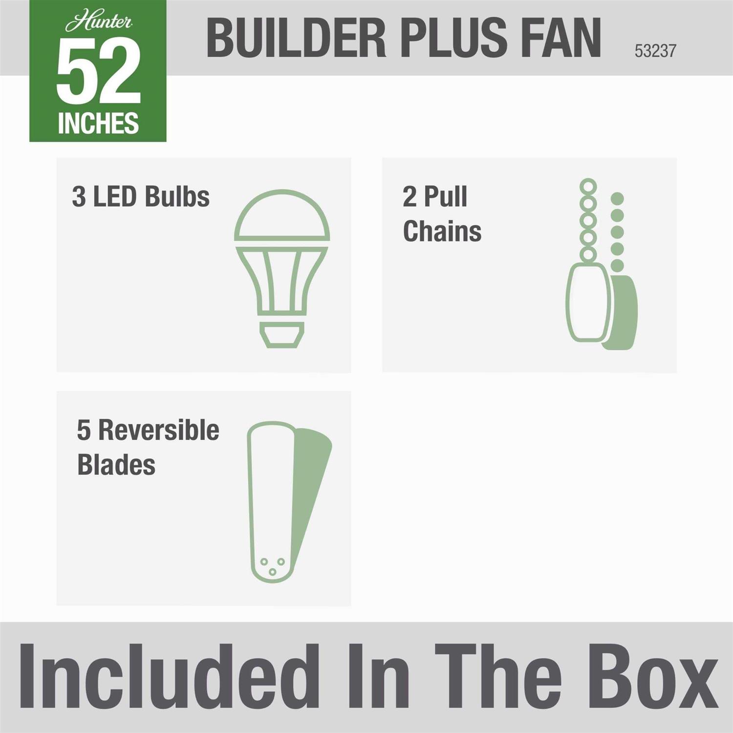 The Builder fan is a mainstay in the Hunter product line for a reason. The casual, traditional style will compliment your room without overpowering it. With a 52″ blade span, a variety of finish options, and the ability to install with or without the light kit, the Builder Plus is flexible enough to fit almost any large room you choose. WhisperWind motor delivers ultra-powerful air movement with whisper-quiet performance so you get the cooling power you want without the noise you don’t. Reversible motor allows you to change the direction of your fan from downdraft mode during the summer to updraft mode during the winter. 13 degree blade pitch optimized to ensure ideal air movement and peak performance. For indoor use only. Installer’s choice three position mounting system allows for standard, flush or angled mounting. Pull chain allows for quick and easy on/off and speed adjustments.