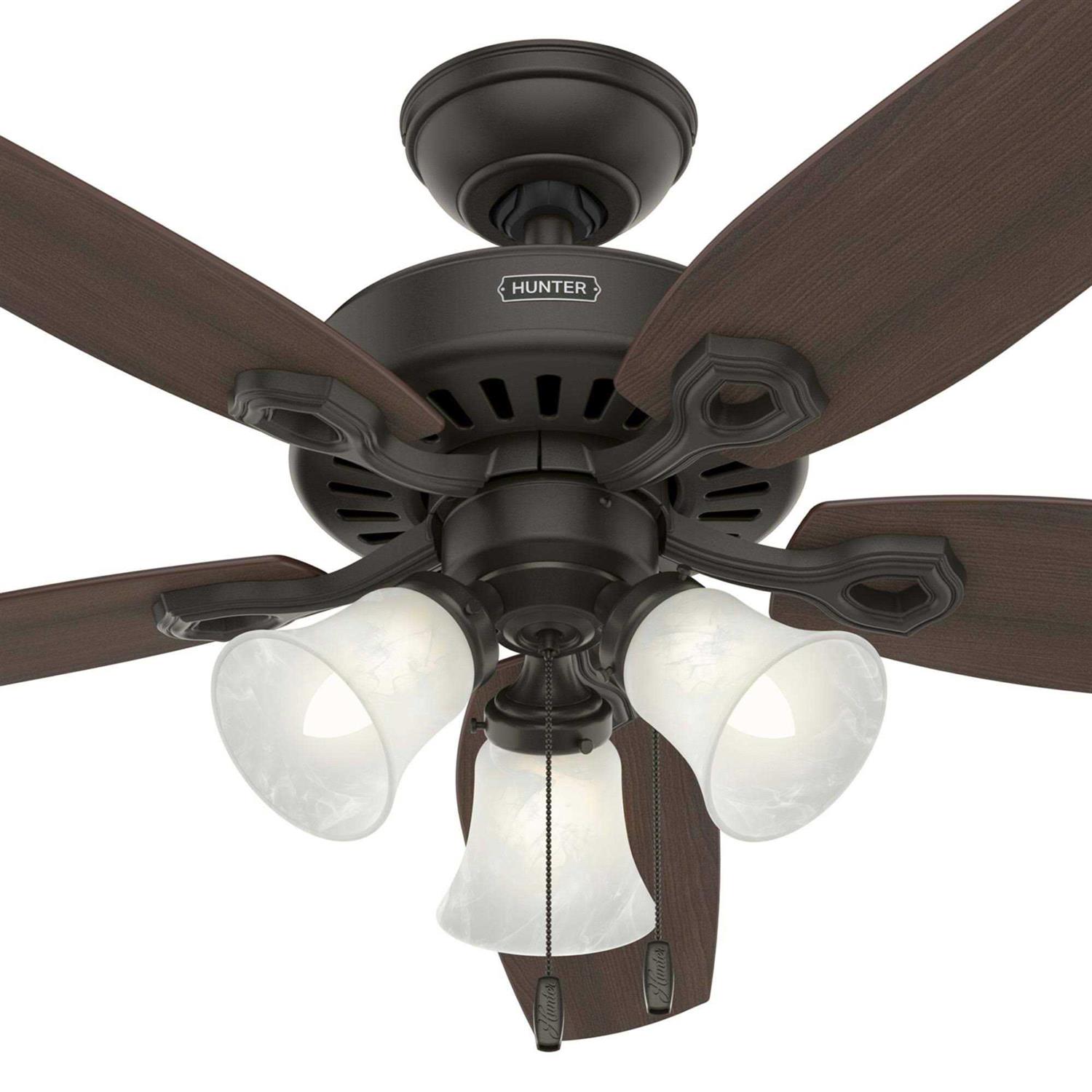 Builders Plus ceiling fan with high performance 3-speed reversible motor that provides energy cost saving by cooling in the summer and reclaiming heat in the winter. Blades reverse to show desired finish. Installers Choice mounting system allows for 3 types of installation: Low profile mounting for ceilings less than 8′, standard, hangs from the ceiling by a downrod, for ceilings 8′ or higher, or angle mount. Uses candelabra base bulbs, included. Can be installed with or without light. For indoor use only.