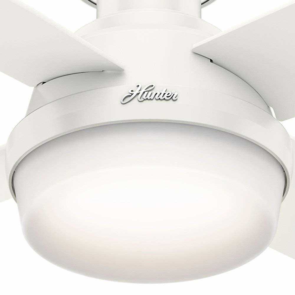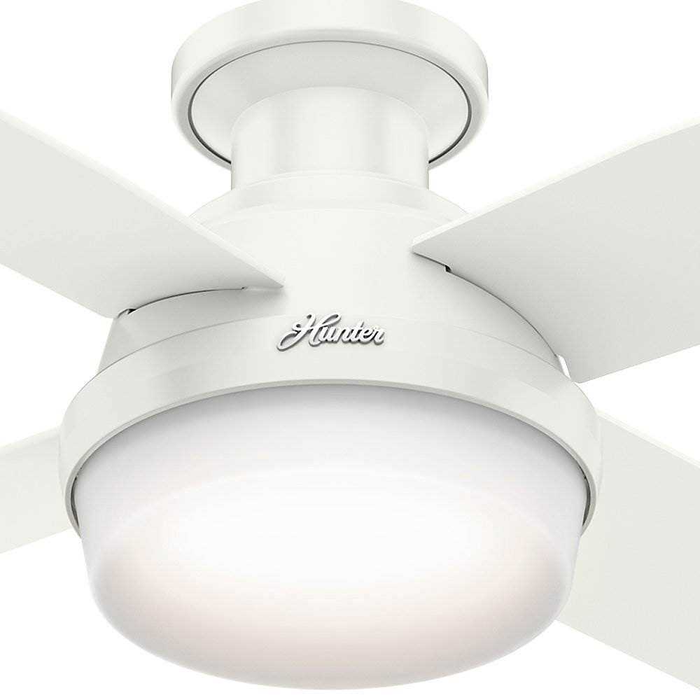 Hunter Dempsey 44 LED Low Profile 44″ Indoor Ceiling Fan: 4 reversible blades; Hunter combines 19th century craftsmanship with 21st century design and technology to create ceiling fans of unmatched quality, style, and whisper-quiet performance. Using the finest materials to create stylish designs, Hunter ceiling fans work beautifully in today’s homes and can save up to 47% on cooling costs! Included components: 4 reversible fan blades. Drum light kit with (2) 10W LED’s. Canopy and mounting hardware. Product technologies: whisper wind motor, available on most Hunter Fan models, delivers ultra-powerful air movement with whisper-quiet performance. Wind to produce the cooling power you want without the noise you don’t. Special features: brushed nickel finish features reversible black Oak and chocolate Oak blades. Fresh white finish features reversible fresh white and blonde Oak blades. 3 speed reversible AC motor. Fan specifications: blade span: 44″. Number of bulbs: 2. Bulb type: LED. Watts per bulb: 10. Bulbs included: yes.