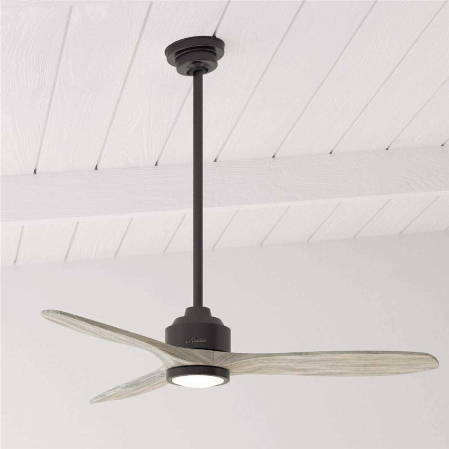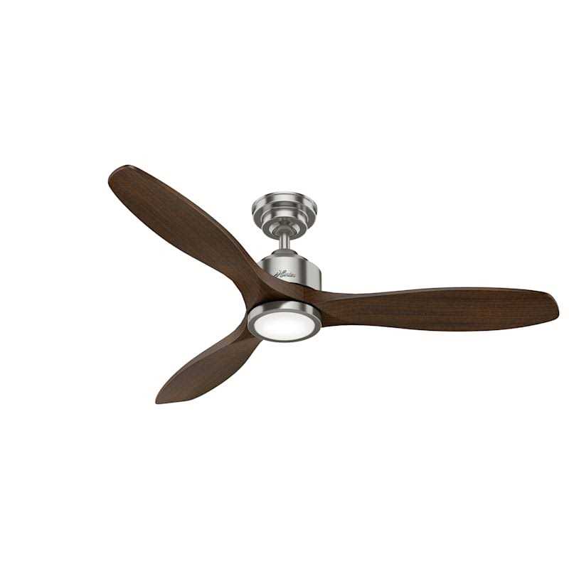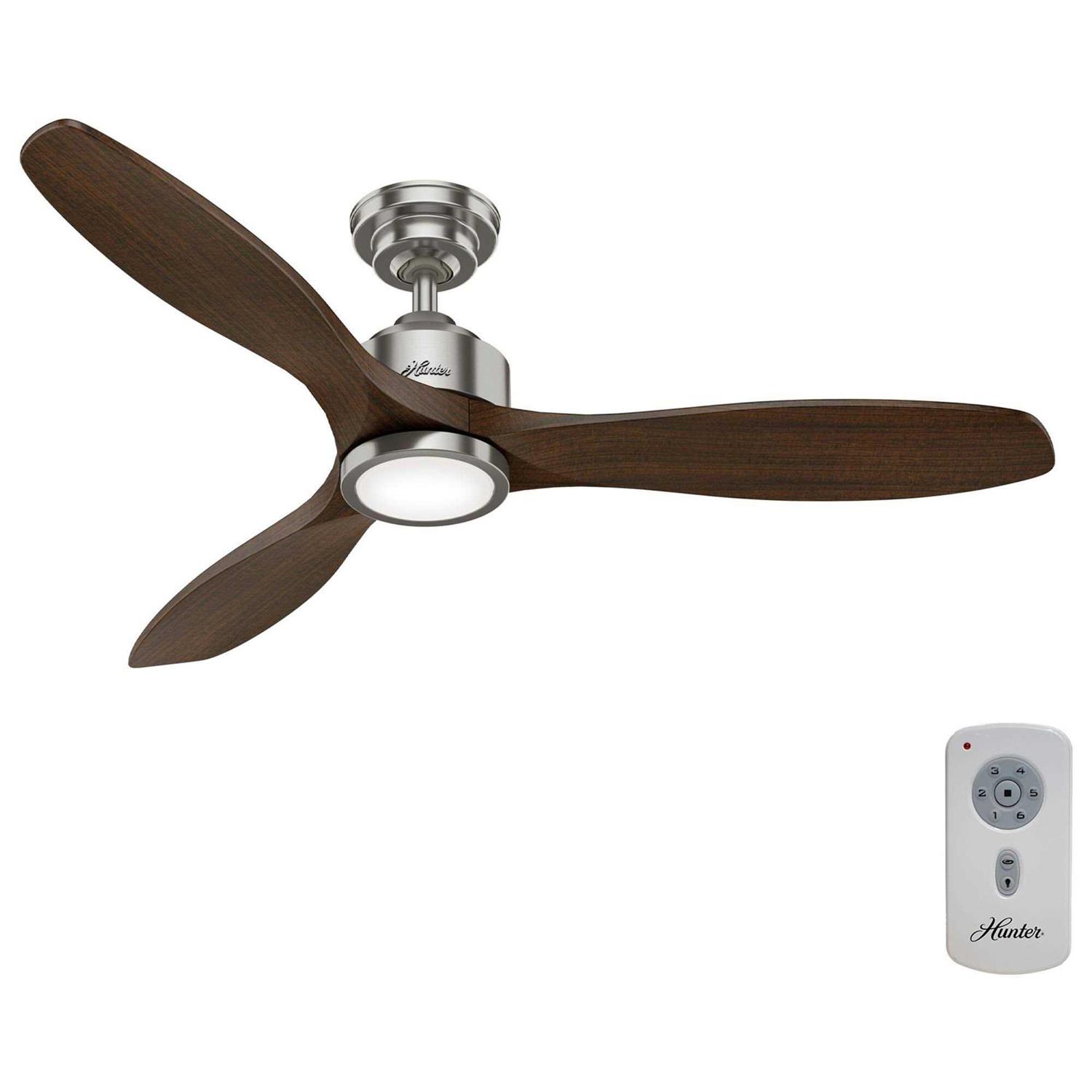 Hunter Fan The sweeping lines on the modern ceiling fan’s carved wood blades make a statement in your large, indoor rooms. The wood grain adds a softness to the look of the propeller inspired blades for a casual look that’s beautiful in Mid-Century modern or modern farmhouse spaces. Use the included remote control to adjust the fan speed and dimmable LED light. This ceiling fan with light’s included LED module means less light bulb changes.