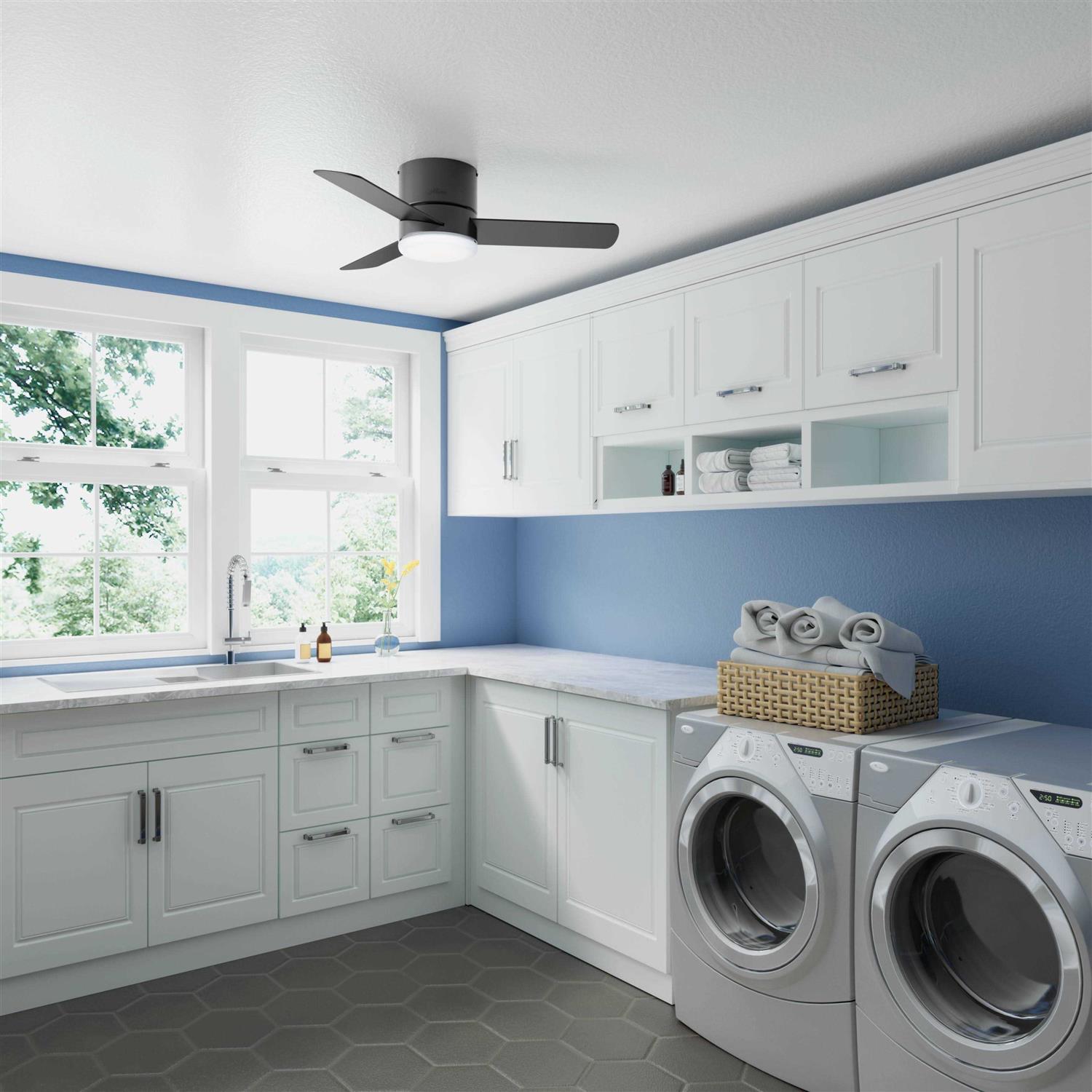 Hunter Fan 44 Minimus-Matte Black – 3181 CFM w/ Light Kit Available in three finishes, the Minimus ceiling fan’s minimalist design makes it a great fit in your modern and transitional spaces. Designed to fit flush in rooms with low ceilings, this ultra-low-profile ceiling fan is perfect for small rooms with low ceiling heights. The Minimus ceiling fan boasts a three-speed WhisperWind motor to deliver powerful, efficient airflow.