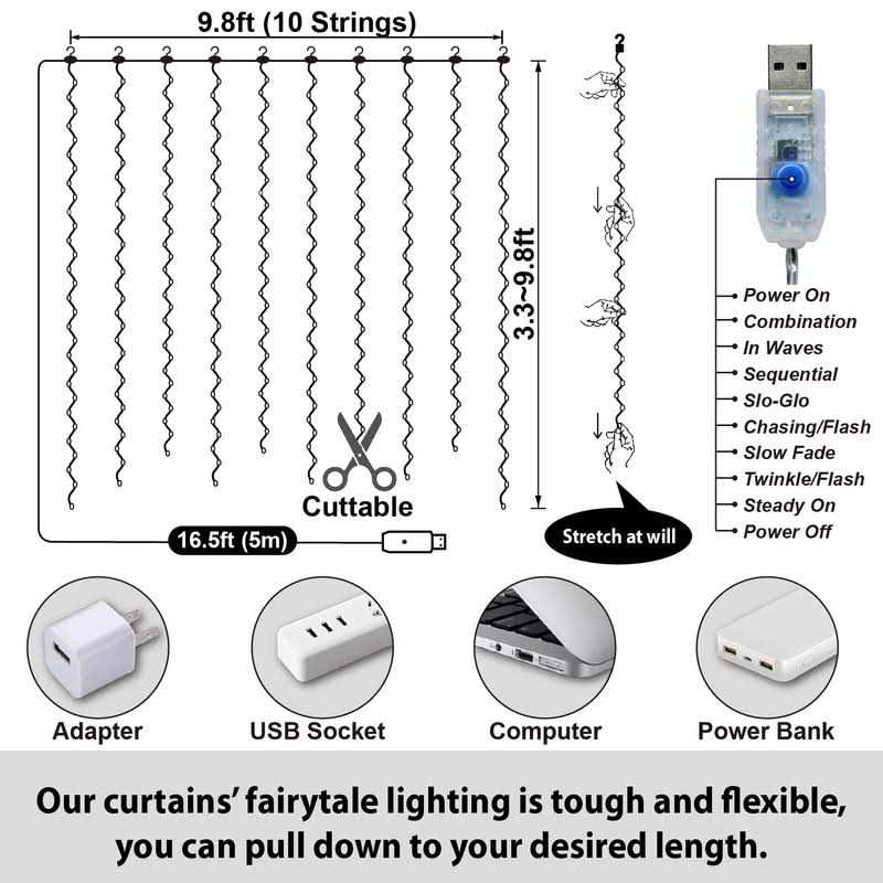 HXWEIYE to bring you a bright, warm, light up your mood. Hxweiye curtain string lights professional upgrade features: S type hanging, adjustable height, you can control the length of stretched lamp string, and the 10 hangers can be drawn to different heights to form your own style. Double light clips configuration, you don’t need to buy any accessories, you can hang the curtain lamp in the curtain, curtain wall glass, wall and other places. The 16.5ft (5m) lead can be connected to the socket at a longer distance without worrying about the location of the socket. USB power adapter is included, so you don’t need to increase the purchase cost. 8 Lighting Modes & Memory Function Combination, In Waves, Sequential, Slo-Glo, Chasing/Flash, Slow fade, Twinkle/flash and Steady on. Each mode has a different lighting effect, and you can choose the right one for different occasions. It could remember the previous lighting mode when you press ON? with remote control, but reset after unplugging. IP44 Waterproof The string lights are IP44 waterproof. Resist moisture and weather damage. But the USB connector is non-waterproof, please keep it away from water. Safe and Easy to Use Lights will not overheat after working for a long time, and people or pets can touch it safely. Remote and Timer The buttons on the remote control can be used to switch lights, change twinkling modes, adjust light intensity and set time (6 hours on, 18 hours off). Specifications: LED