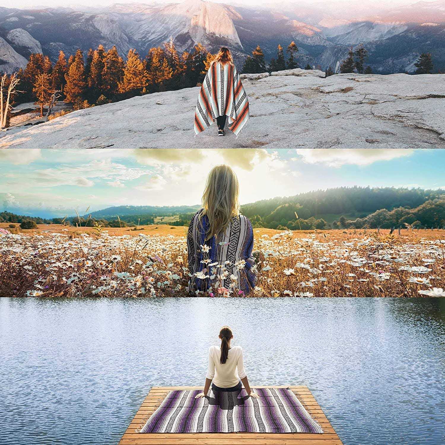 Material 60% Recycled Acrylic and 40% Recycled Polyester Product Dimensions 71″L x 47″W Item Weight 2 Pounds Product Care Instructions Machine wash cold then dry with no heat. Traditionally woven by artisans in Tlaxcala, Mexico, these vibrantly colored Indian blankets, bring to mind the charm of old Mexico as they have remained the same since the times of the Conquistador’s. Nothing will keep you warmer on a chilly night than a Baja or a Mexican blanket. And, mi amigo, you will look slick! Oh si, si! Our Aztec Blankets: are so authentic that no two blankets are the same and have slight variations in size and weight as part of their timeless feel and look. While being beautifully handcrafted and remaining true to their heritage our blankets have become very versatile and stylish which is why people now use them as hippie blankets, a poncho, yoga blankets, car blankets, horse blankets, park blankets, camp blankets, neutral home decor, camping essentials, tribal-western-southwestern blanket. They Get Softer With Every Wash: becoming soft throws that cover a twin bed while maintaining its durability. The more you use it, the cozier it gets. Made with 100% recycled materials, measuring about 71″ x 47″ and with approximately two pounds of 60% Recycled Acrylic and 40% Recycled Polyester, our authentic blankets are thick, machine washable on cold water and are to be tumble dried with no heat. Our Eco-friendly Products: are the perfect housewarming gift, also perfect for: Christmas, Holydays, anniversaries, Valentine’s Day, Mother’s Day, farmhouse fall decor, as a beach blanket sand proof and any other.