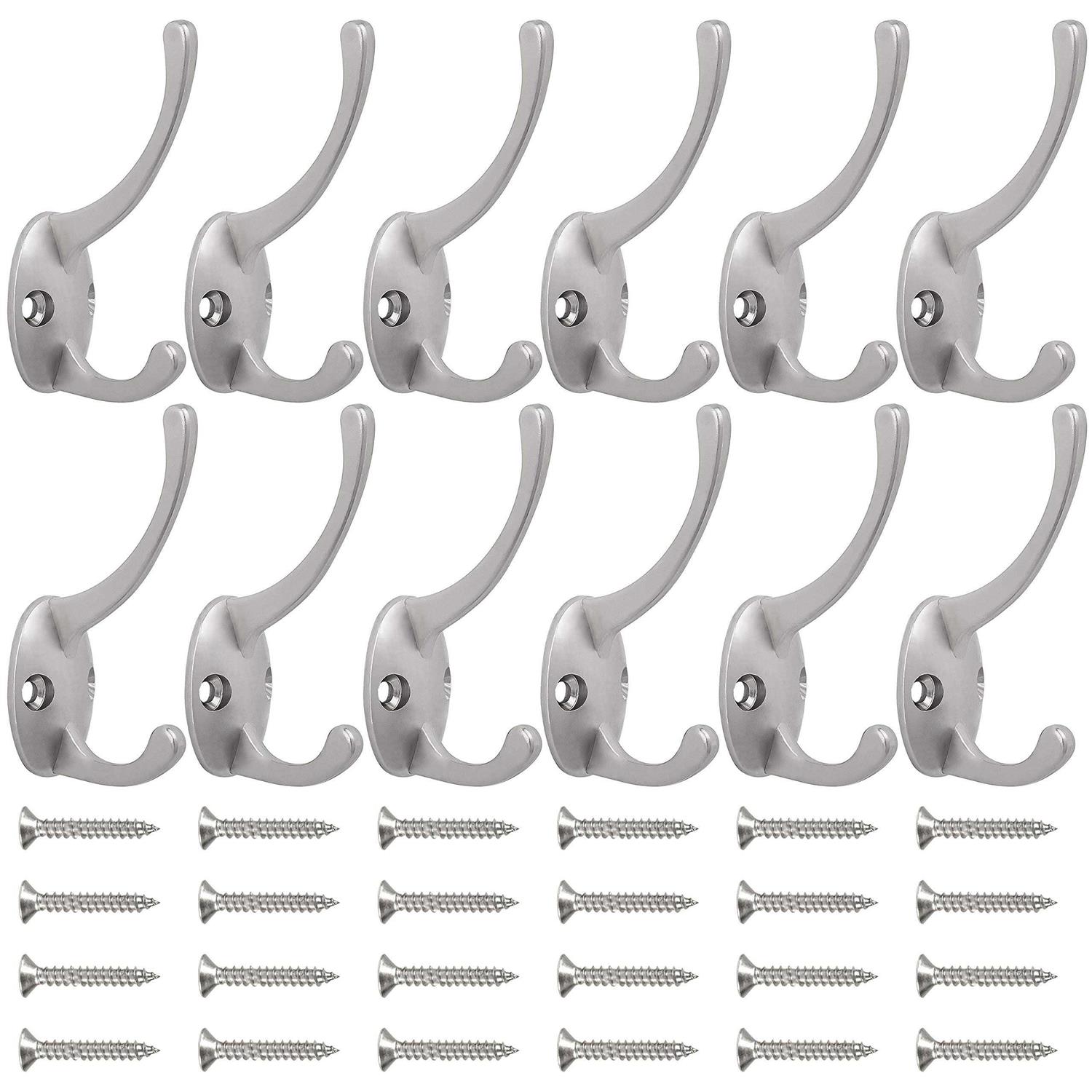 Ibosins 12 Pack Silver Coat Hooks Wall Mounted with 24 Screws Retro Double Hooks Utility