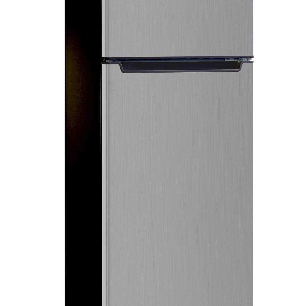 Top-Freezer Refrigerator in platinum with recessed handles in black features upfront temperature controls that make it simple to regulate both the fresh food and freezer sections. Adjustable shelves provide flexibility to meet your food storage needs. Combines easy-to-use features with practical design to complement any kitchen.