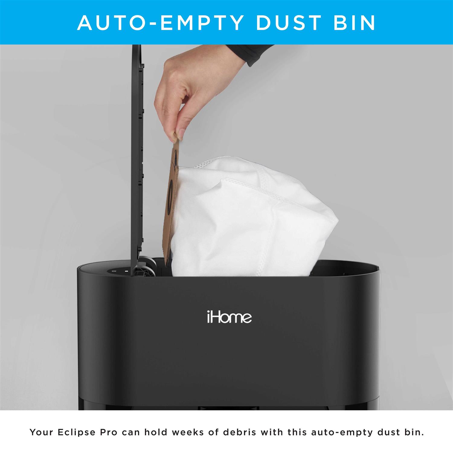 Take Cleaning Off of Your To-Do List with the iHome AutoVac Eclipse Pro. Top of the line features include PowerMop Scrub, a mopping system that vibrates and agitates your floor to ensure squeaky clean floors, unlike other traditional robot mopping systems. In addition, the Eclipse will dock at the Auto Empty Base, which holds debris for weeks at a time! The 2-in-1 Tank System allows for Vacuuming and Mopping at the same time (or separately). HomeMap Navigation ensures the Eclipse cleans row by row, and doesn’t miss any spots! The New iHRV11-BLK weighs less than 10lb. After cleaning, the Eclipse intelligently navigates back to the Auto Empty Base to automatically empty the dustbin contents and recharge. The bag lined bin holds weeks worth of debris so you don’t have to! Innovative scrubbing technology ensures it agitates and cleans stubborn spills with vibrating mopping technology. Neatly cleans row by row with built in sensors to ensure there are no missed spots. View your floor plan in the iHome Clean App. Vacuum and Mop simultaneously with the 2-in-1 tank. Debris is stored in the dry compartment as the mop follows with a wet pass. Set your desired water flow and the electronically controlled tank handles the rest. Connect Nova to Wi-Fi for voice and app control when you want it. Use the iHome Clean App to manage Nova from anywhere and connect to Google Assistant to control your AutoVac by voice. Hyper Drive Plus with 2700pa suction power handles fine dust, stubborn dirt, pesky dirt hair and more. Hyper Drive automatically engages when Nova detects carpet for optimal cleaning.