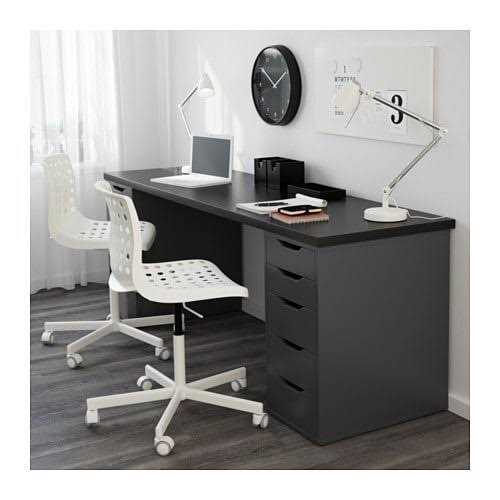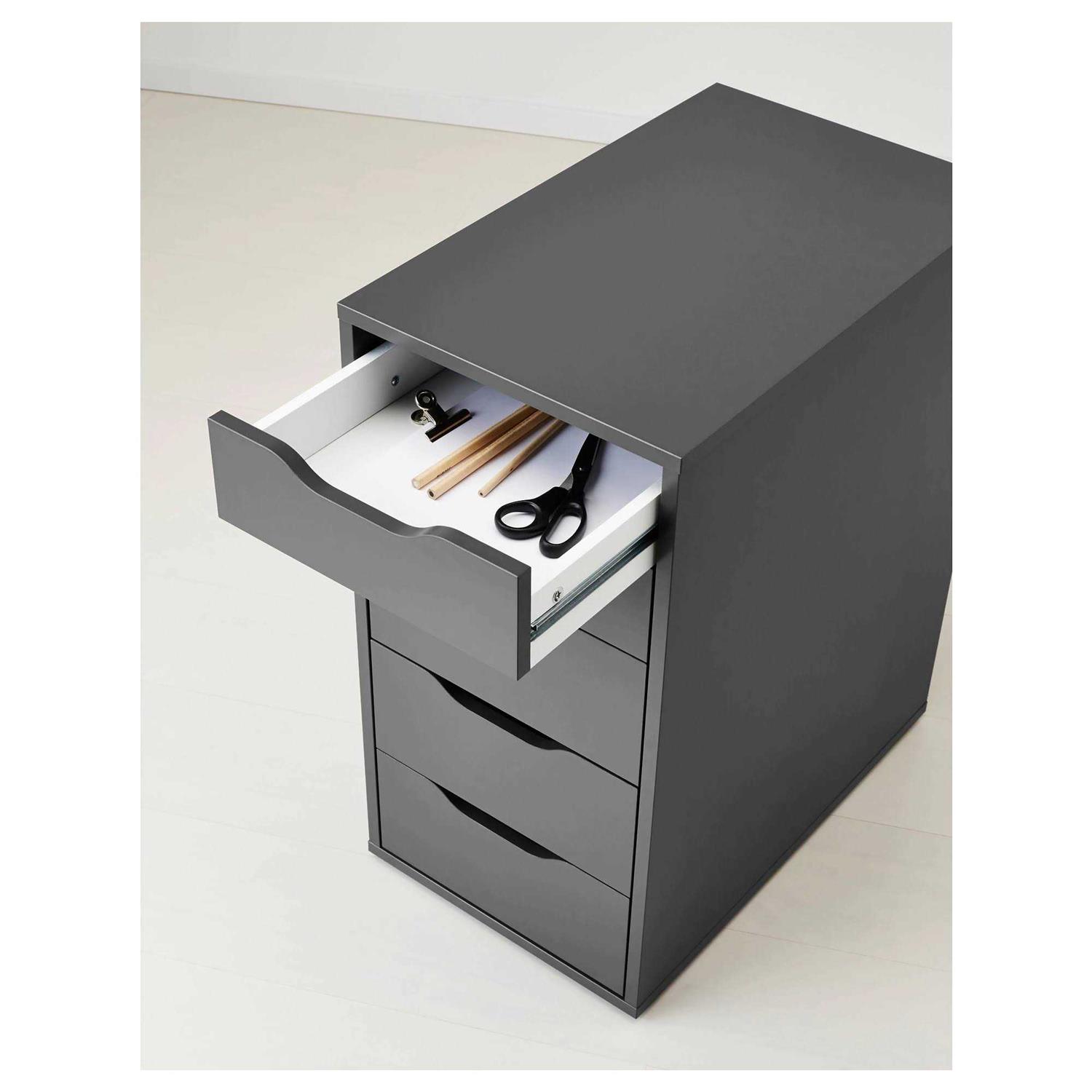 Drawer stops prevent the drawers from being pulled out too far. Width: 14 1/8 ” Depth: 22 7/8 ” Height: 27 1/2 ” Plastic bumpers for holding the table top in place are included. Ikea Alex Drawer Unit, Gray A clean look that’s easy to like and mix with other styles, either supporting a desk or standing alone. The back is finished so you can place it in the middle of the room – all sides are just as beautiful. Main parts/ Drawer front: Particleboard, Acrylic paint, Melamine foil, ABS plastic Bottom panel. Back panel: Particleboard, Melamine foil, ABS plastic Drawer back. Drawer side: Particleboard. Foil Drawer bottom: Fiberboard, Acrylic paint. Drawer stops prevent the drawers from being pulled out too far. Can be placed anywhere in the room because the back is finished. Good to know Plastic bumpers for holding the table top in place are included. Care instructions Wipe clean using a damp cloth and a mild cleaner. Wipe dry with a clean cloth.