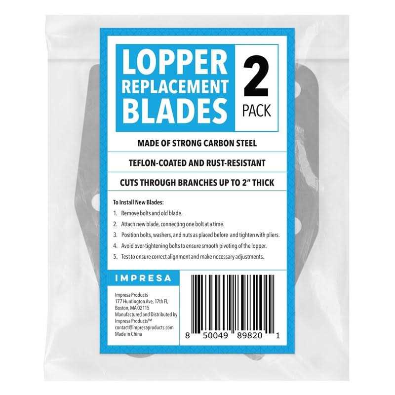 Cut through the Clutter Refresh your pair of long loppers with these Impresa large blades for Fiskars lopping tools PowerGear Bypass Lopper 25″ & 31″ and for PowerGear 2 Bypass Lopper 27″. Slice through branches like butter with Impresa hedge lopper blades for Fiskars replacement parts capable of cutting branches up to 2″ thick. Made from high carbon steel and coated with PTFE to reduce friction, the Impresa blades for Fiskar replacement parts offer smooth cuts and rust resistance. Instructions: – While wearing suitable safety gear, remove both 1/2″ bolts using a wrench with a 1/2″ socket or a 1/2″ combination wrench. Do not lose washers or nuts when removing the anvil lopper blade. – Remove the old garden loppers blade and position the replacement. Reconnect the blade one bolt at a time. – Reattach one bolt at a time. Position each so it connects the hand loppers to the blade. Add the original washer and nut. – Tighten the nut until the head of the bolt begins to spin. Use pliers to hold the head of the bolt static to finish tightening. – Do not over-tighten the bolt! The gardening loppers still need to pivot smoothly. Loosen nuts slightly if lopping shears don’t open and close easily. – Repeat the process for the second bolt. For correct alignment, attach the new blade with the anvil loppers completely closed. – Test to make sure the loppers for gardening open and close easily. Make any necessary adjustments. Note: This is an aftermarket product manufactured by Impresa. Any other brands mentioned are for illustrative purposes only and are in no way affiliated with Impresa, nor do they endorse Impresa.