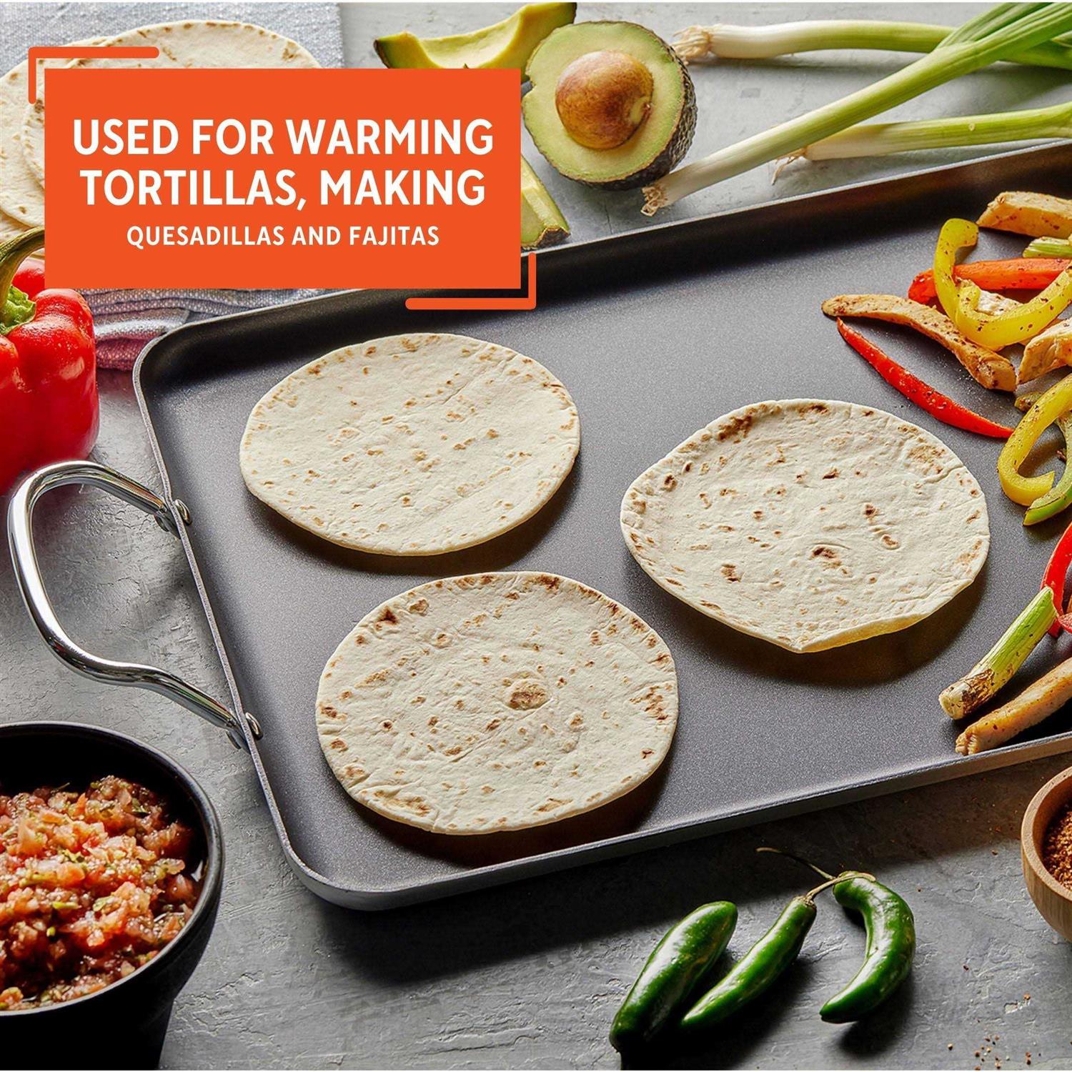 IMUSA 17 x 10 double Burner Griddle is perfect for warming tortillas, making crepes, toasting sandwiches, cooking quesadillas, and all your favorite breakfast foods such as pancakes and eggs. This double burner will heat up quickly and evenly allowing you to use the entire surface of the griddle. The non-stick surface allows you to use less oil and makes clean-up a breeze and allows you to make healthy foods at home for the entire family. Feel free to use the griddle as a serving piece after cooking. The nonstick and large cooking surface provides enough room to cook a variety of different food at the same time. The side handles are perfect to use while cooking and also when transporting the vessel from one place to another. Next time you have a Mexican Party or are in the mood for tortillas or making a nutritious breakfast, make sure to use your IMUSA double burner griddle. Keep in mind this burner fits perfectly over two stovetop burners and can be used on an electric or gas stove.