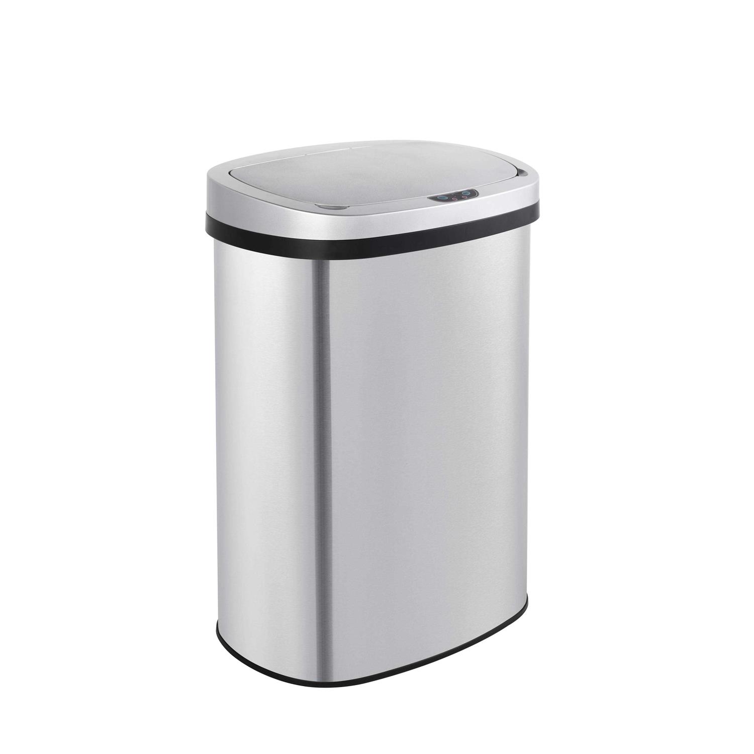 Innovate 13-gallon stainless steel oval kitchen motion sensor trash can has a sensor-activated lid that opens automatically with a wave of a hand for touch-free operation and easy trash disposal. Stainless steel with fingerprint-resistant coating. A stay-open control feature and non-skid base provide for longer chores and convenient trash removal. Perfect for kitchen, home office, and business office breakroom.