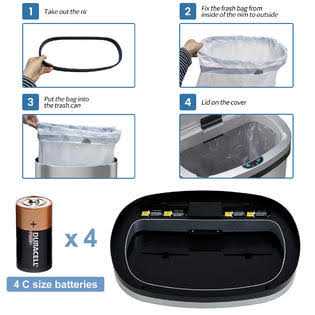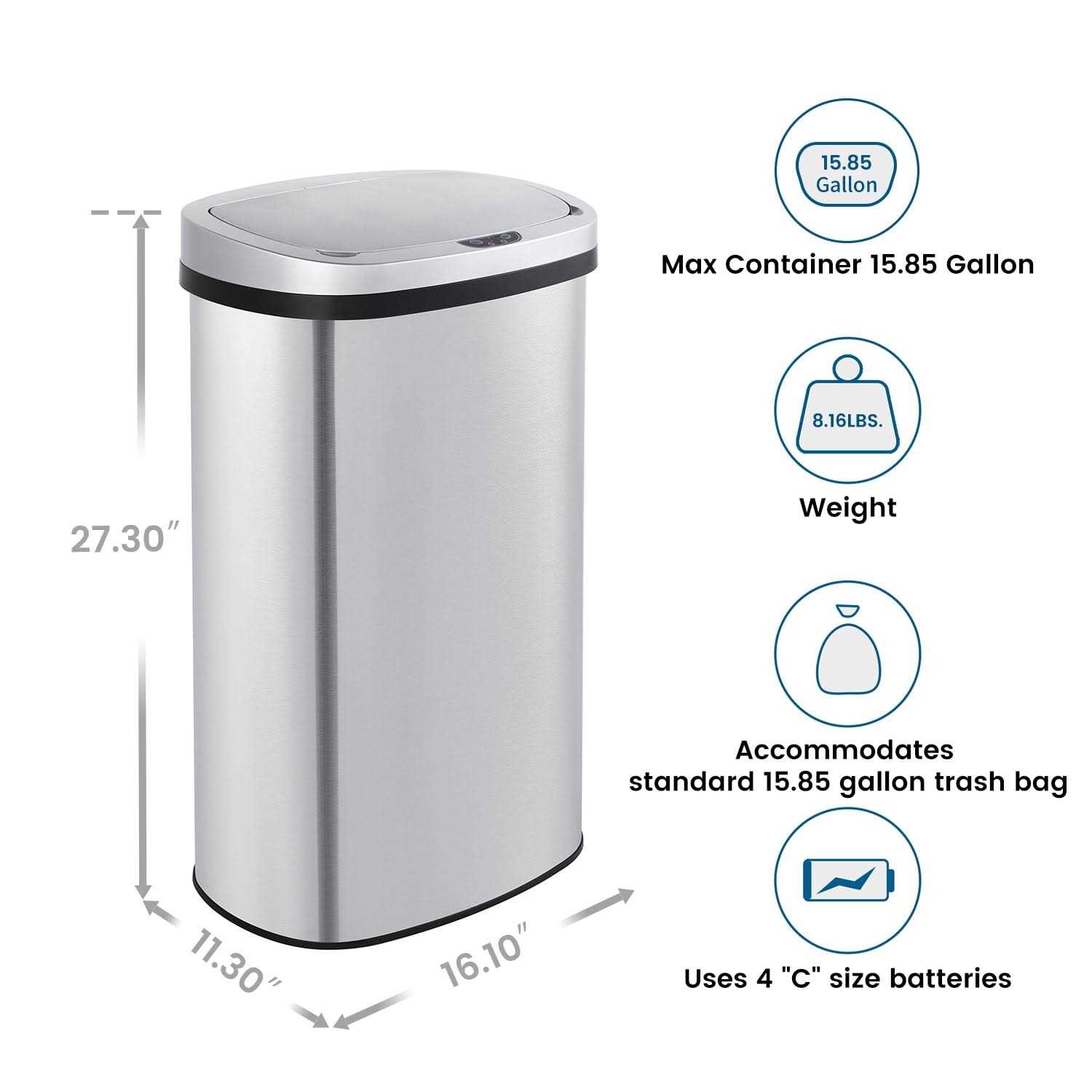 Innovaze 15.85 Gallon/60 Liter Stainless Steel Oval Kitchen Motion Sensor Trash Can has a sensor activated lid that opens automatically with a wave of a hand or object for touch free operation and easy trash disposal. Silver stainless steel with fingerprint resistant coating. A stay open control feature and non-skid base provide for longer chores and convenient trash removal. The removable inner ring holds a trash bag in place and the lid hides the trash bag overhang for a neat appearance. Perfect for kitchen, home office and business office breakroom.