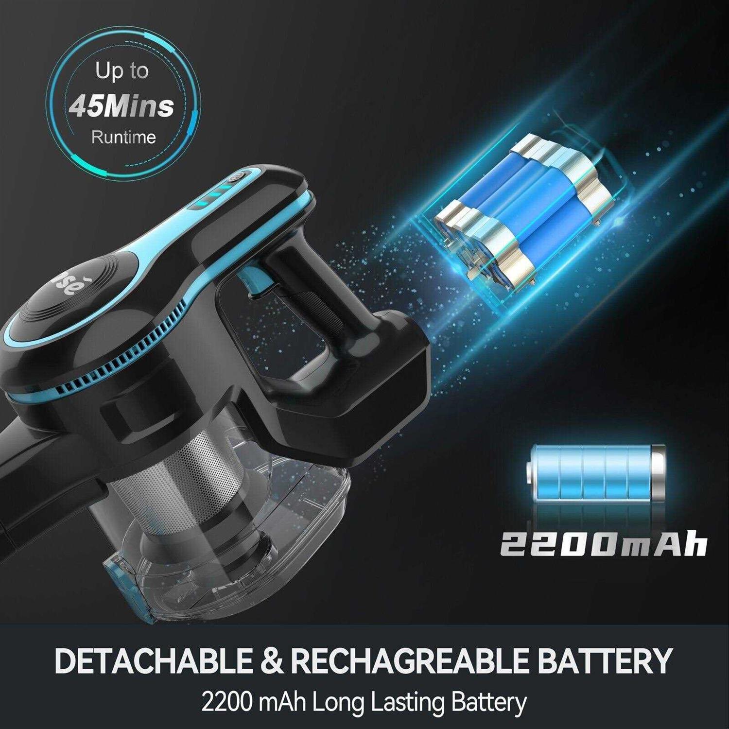 Impressive Powerful Suction – The vacuum cleaners for home features 180W upgraded motor, provides strong suction on max mode, captures pet hair, cat litter, pet food, and other messes on the hardwood floor, low-pile carpet, stairs, bed, curtain, furniture, car, RV, etc. This vacuum cleaners for home generates less heat and less noise (65db) to offer a quiet cleaning environment. 45 Mins Runtime & 1.2 L Large Dustbin – The cordless vacuum cleaner is equipped with 6-Cell battery of 2200 m-A-h and a 1.2 L large dust cup. They work together to ensure one thorough cleaning of a whole house of 180m2 (1937.50 sq ft) for 30-45 mins on standard mode, 15-20 mins on max mode . The battery is detachable and rechargeable, so you can charge either the stick vacuum integrated or the battery separated. With a 1.2L large dust cup, you can easily empty the dustbin with a one-button press.