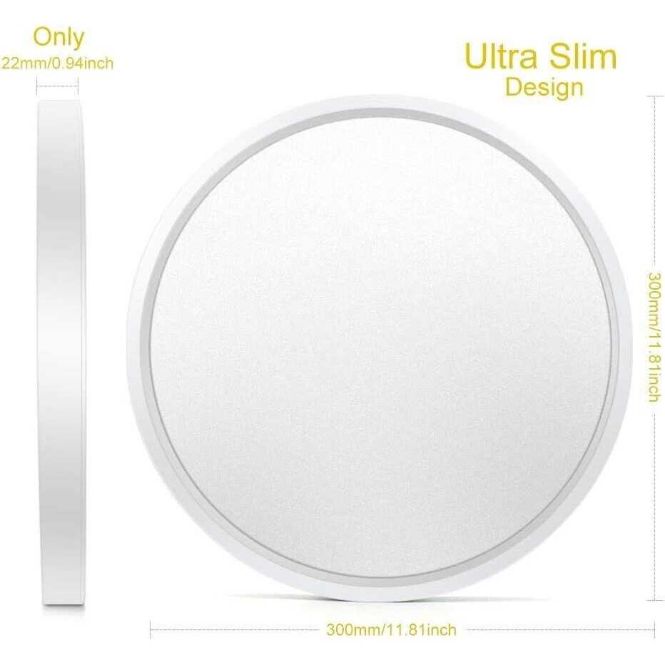 Brand: inShareplus Features: 【Ultra Thin Design】: Thickness is only 0.94 inch, won’t look abrupt or affect the decoration. The surface of this surface mounted ceiling light is smooth, without bulges, perfect for various decorative styles. 【Economical】 24W LED equivalent to a traditional 240W Incandescent bulbs by our flush mount led ceiling light can save 85% on electricity bill of lighting. Built in 120 piece LED chips without flickering, shine evenly, no incandescent bulbs needed. 【Easy to install】12 inch ceiling light LED flush mount, just 2 steps to complete the installation. Install the base under the ceiling, screw the light onto the base, and you are done. Rust proof treated white finish New Round Flush Mount Thin Ceiling Light suits different home styles. 【Super Bright】 High quality plastic material light cover, premium led beads, providing the best distance from the light cover to the led beads, anti-glare lampshade with best light transmission. Extremely long life reduces re-lamp frequency. Save your effort to replace bulbs in high ceiling. 【Eye-Protective Design】 The milk white plastic housing and qualified LEDs, Keeping your eyes free from the harsh glare of traditional lighting. Instant on, mercury free light. The appearance is elegant, neat, and concise, for different lighting decoration style Details: Specifications: Name: LED celling light Wattage: 24W Input: 100-277V, AC Light Output: 3200 Lm Color Temperature: 5000K CRI: 80+ Beam Angle: 120 Light Source: LED Size: 30*30*2.5 cm Average Life (hours): 30000 Incandescent Equivalent: 240W Package Contents: 1 * LED Ceiling Light 4 * Mounting Screws Package Dimensions: 12.0 x 12.0 x 1.2 inches