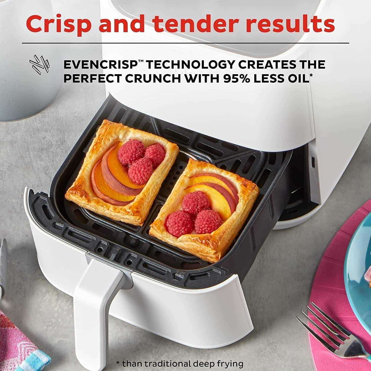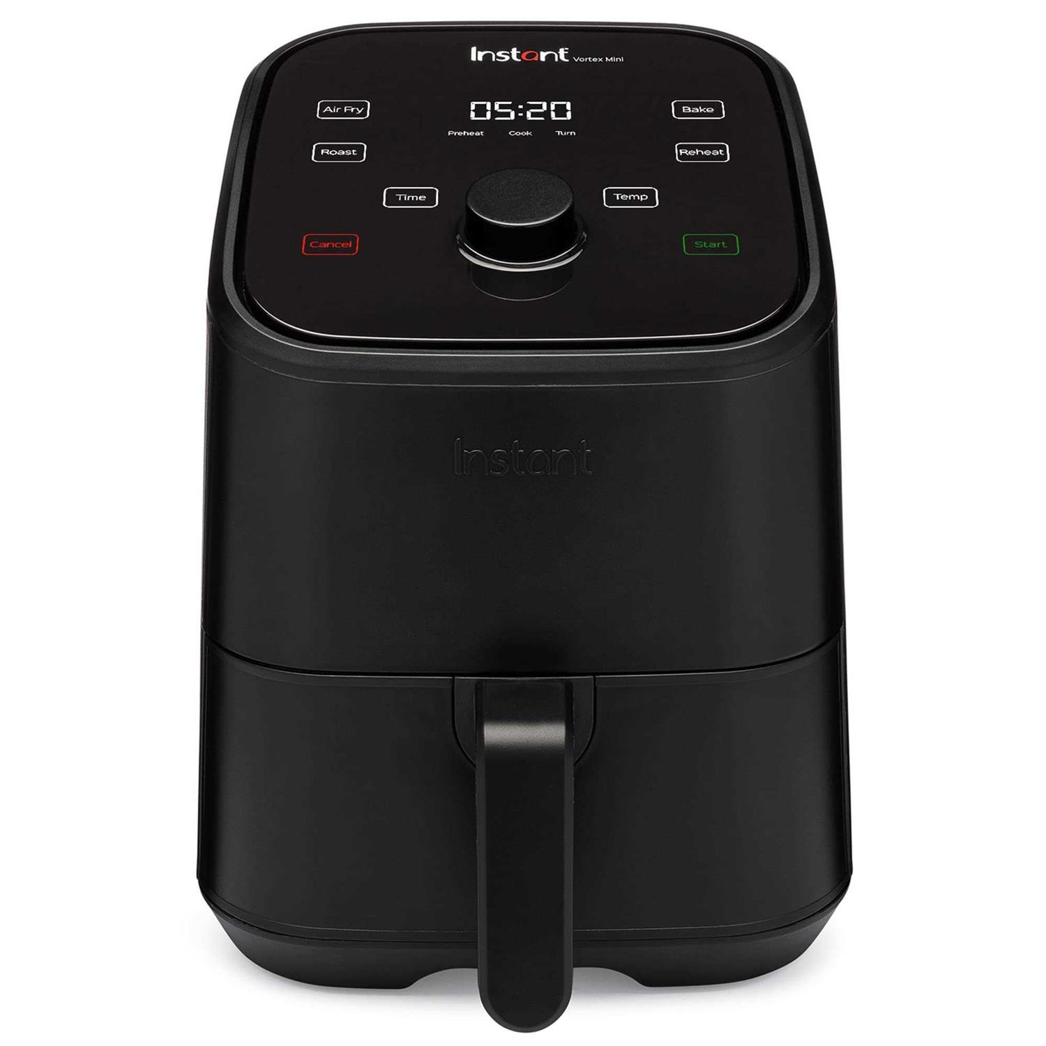 Easy to use, easy to clean, fast, versatile and convenient. Use the preset Smart Programs to easily air fry, roast, bake and reheat. Air fry chicken fingers and crispy fries, onion rings and jalapeño poppers. Roast cauliflower bites, shrimp, and garlicky potatoes. Bake calzones or pizza bites, gooey cinnamon rolls and molten brownie bites. Reheat leftovers or make a breakfast sandwich in a fraction of the space of a microwave. Use up to 95% less oil Enjoy crispy fried chicken wings, french fries, onion rings, mozzarella sticks, crispy fish and vegetables and more — guilt-free. Achieve that deep-fried taste and texture with little to no cooking oil as your food is cooked by circulating hot air driven by a powerful fan. Easy cleanup. Minimal grease means minimal mess. Plus, the surface wipes clean and the drip pan and cooking trays are dishwasher safe. Bottom line With the Instant air fryer you can create healthier versions of all your favorite fried foods. From fresh to frozen, the Instant Vortex Mini crisps to perfection with little or no oil. New 4-in-1 air fryer to quickly air fry, bake, roast and reheat perfectly; 4 built-in customizable smart programs help put cooking on autopilot. Dimensions (L x W x H)9.02 x 11.26 x 11.73 Inches.