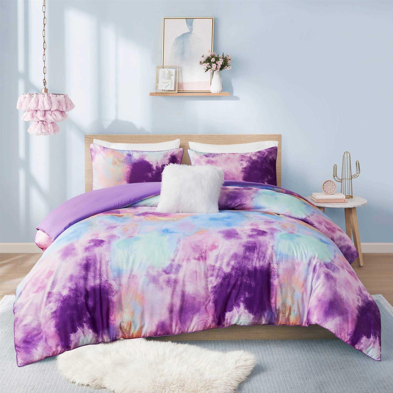 Bring a splash of beautiful color to your bedroom with the Lisa duvet cover set. This pretty pick features a watercolor tie-dye print with piped edging to create a colorful, dreamy look. The matching sham also has piped edges that pair perfectly with the duvet cover. Also included is a square faux fur decorative pillow that adds a chic textural touch. This tie-dye duvet cover set also has an antimicrobial* treatment that provides built-in freshness protection, reducing the growth of odor causing bacteria to keep fabric lasting longer. A button closure at the foot end allows you to place a padded insert within the duvet cover and internal corner ties prevent it from shifting (insert is not included).