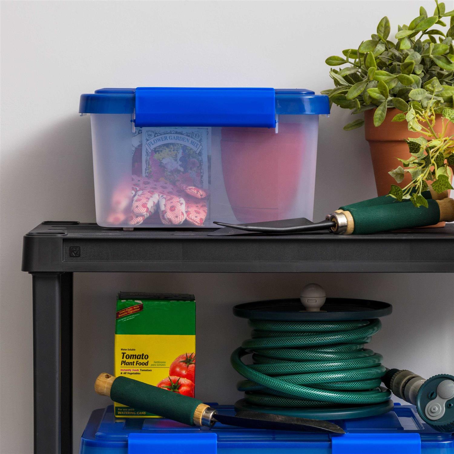 Store your favorite keepsakes and other valuables in this 6 qt. Weather Pro heavy-duty storage tote. The Element Resistant seal on the storage bin lid protects contents by keeping air and moisture out. Safely store up to 8 lbs. of material, such as crafting supplies, photos, and sentimental items in these small storage containers. The grooves in the reinforced lids means these 6 qt. stackable totes with lids can be placed on top of each other to save space. Create a customized storage with other sizes in this Weather Pro storage totes family; 19 qt., 31 qt., 41 qt., 47 qt., 63 qt., 74 qt. and 156 qt. Weather Pro heavy-duty storage totes.
