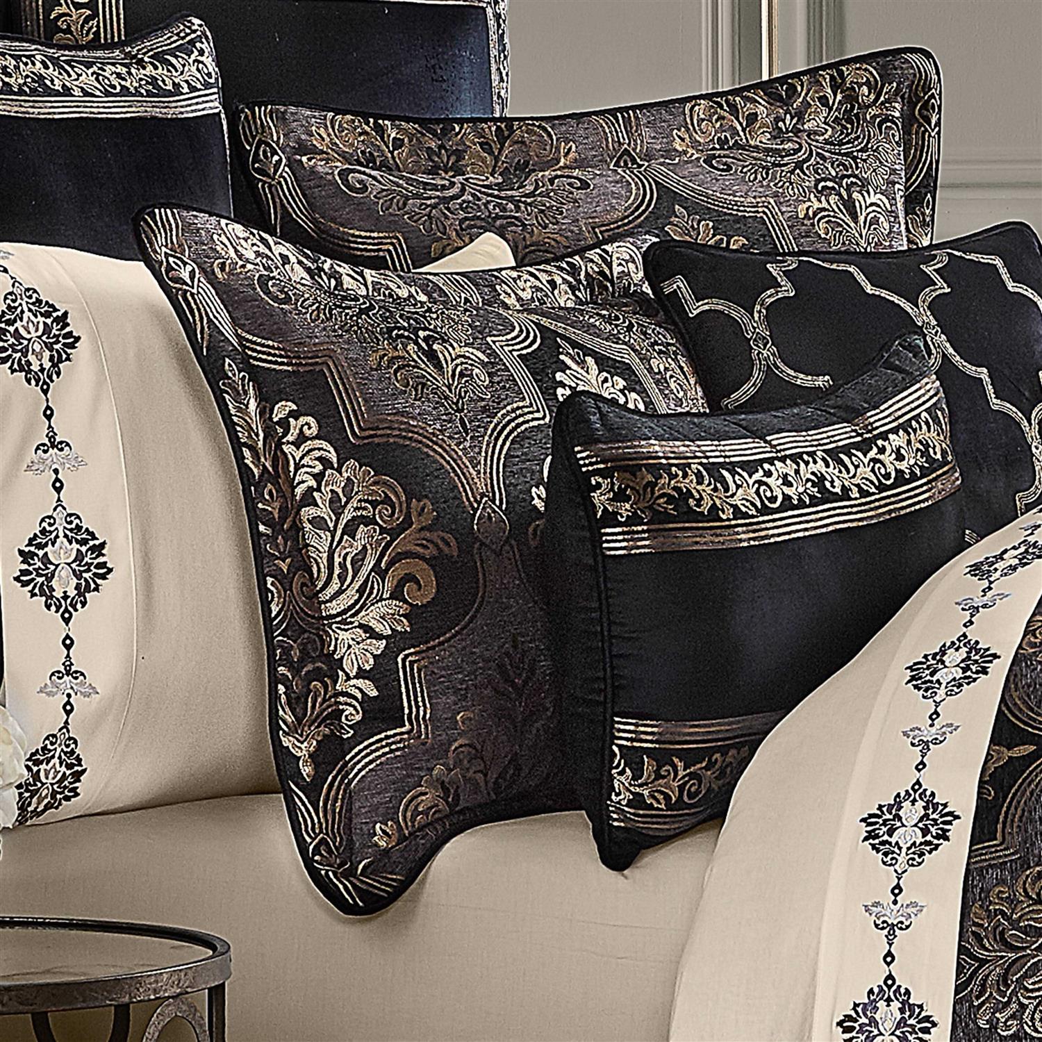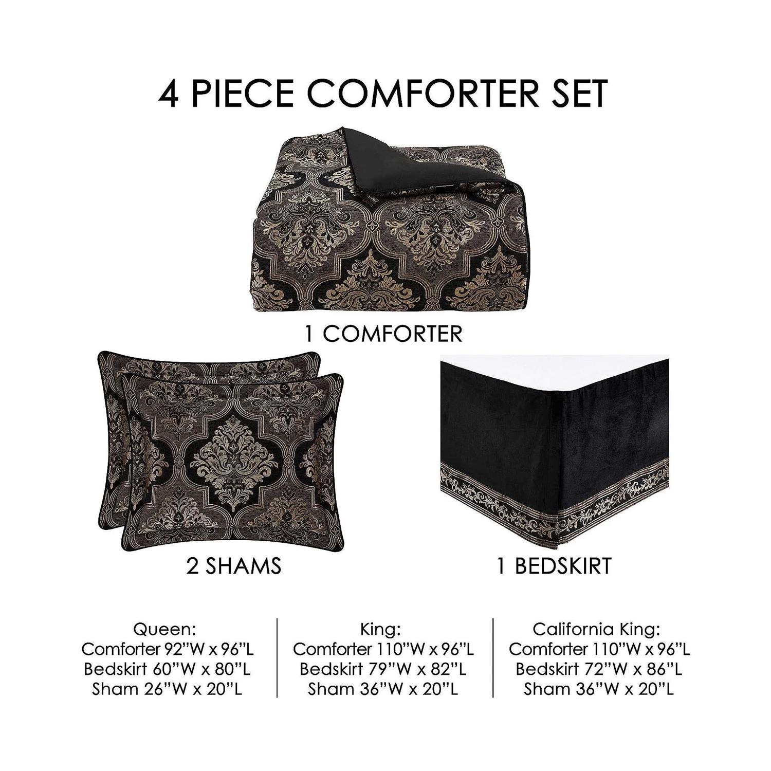 The Windham Quatrefoil Comforter Set refines your bedroom with luxurious panache. From J. Queen New York, the polyester ensemble features black and charcoal chenille quatrefoils filled and outlined in lavish jacquard-woven gold. Elegant damask fills each quatrefoil with a timeless and exquisite class. Oversized comforter has piped edges and a black polyester back; fill is polyester. Shams have padded flange with piped edges; zipper closures. The 15″ drop bedskirt is black velveteen pieced with jacquard-woven acanthus leaf scrolls and stripes, tailored edges, and split corners. Dry clean only. Imported. From J.