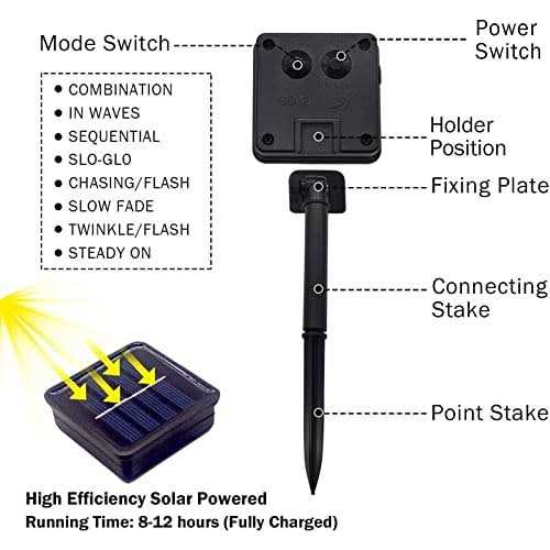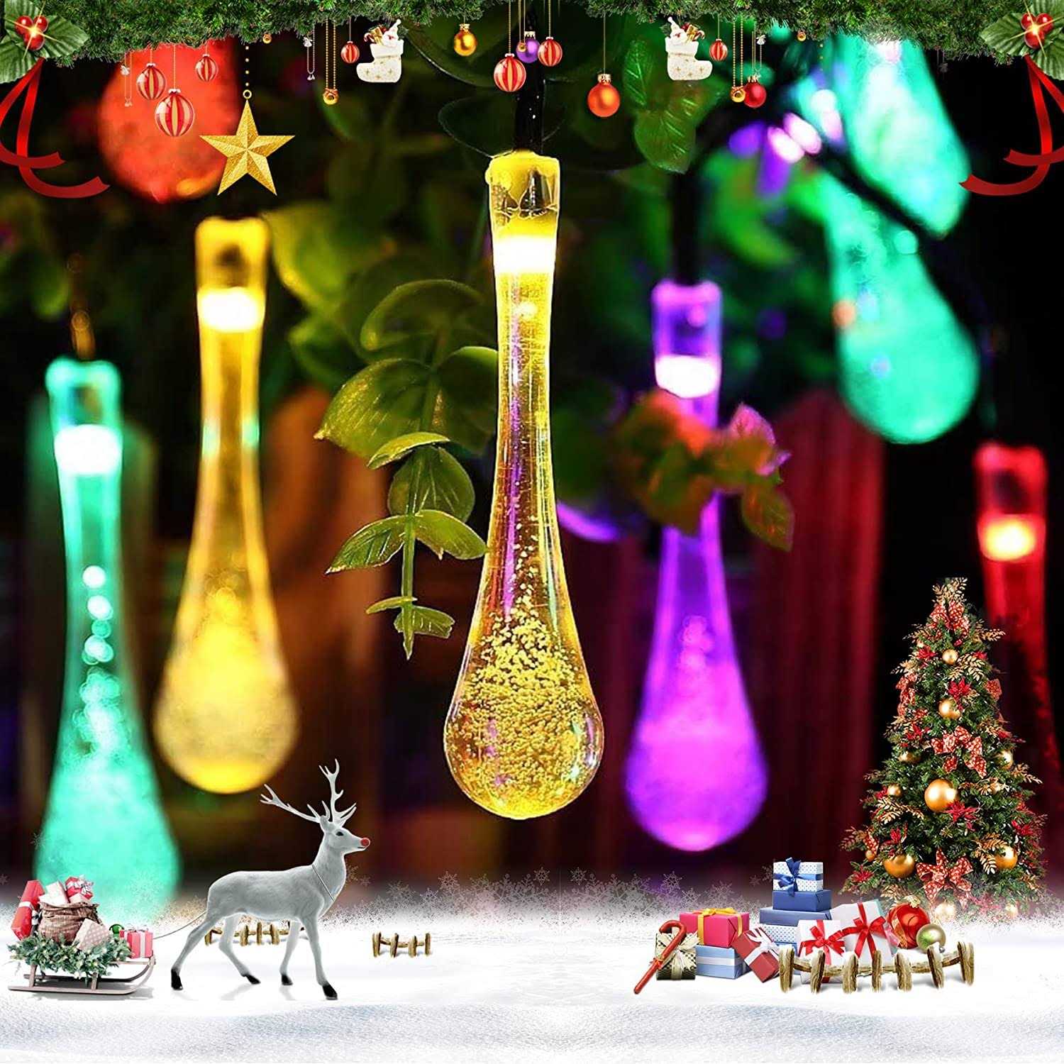 【Unique Design & Size】The design of this solar christmas string lights is inspired by the natural element —water drop, aiming to create a colorful festive atmosphere in your home by the crystalline water drop shape. The total length of this string lights are 20.8FT, the lamp length is 14.2FT and the lead length is 6.6FT. With 30 LED, each lamp head is spaced 6in apart. 2 string lights with solar panels and brackets. 【8 Modes and Memory】Press the mode button of the rain drop style solar light string selects 8 different modes: including in waves, sequential, combination, slow glow, chasing/flash, slow fade, twinkle/ flash, steady on.Multiple colors and different styles of lighting changing effects are intertwined, just like appearing splendid rainbow in the night and having the built-in memory chip will automatically remember the last setting, saving you the trouble of resetting. 【Energy Saving and Auto On/Off】: Charged by solar energy, eco-friendly and without electric cost, the battery can last to work more than 18 months. Light sensor controls the waterdrop solar garden string lights auto on keeping on lighting 6-8h at dark and auto off at daytime. 【Waterproof & Wide application】The outdoor solar christmas string lights can withstand all kind of weather. It can be lighting as usual whether it is windy or rainy when the solar battery is fully charged. If you want to decorate your garden, courtyard, roof, porch, home, etc, this solar string lights will be your ideal choice.