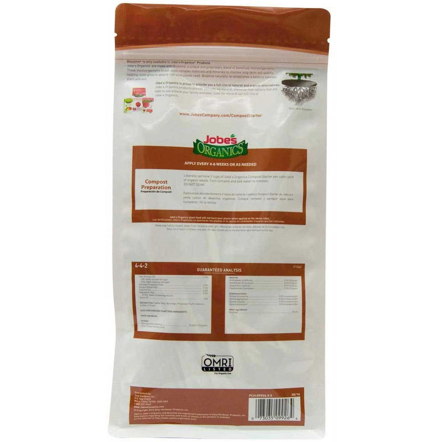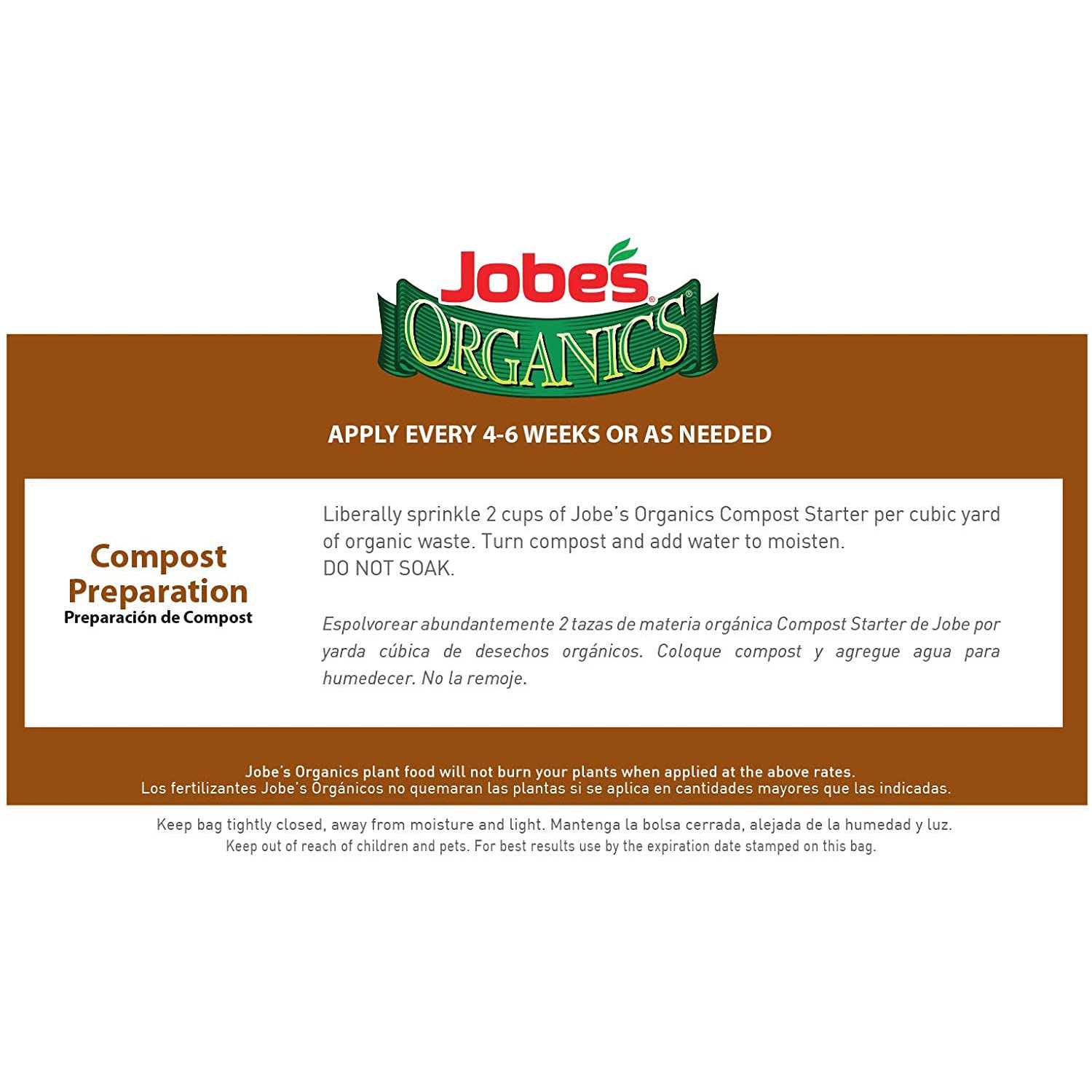 Fertilizers & Plant Food by Jobe’s Organics. Details:Jobes Organics Granular Compost Starter (4-4-2) is specially formulated to promote fast composting. The first fast-acting organic fertilizer for results you can really see. The secret is in Jobe’s Biozome, a consortium of three microorganisms – bacteria, mycorrhizal fungi plus a unique species of Archaea – an extremely aggressive microorganism that quickly breaks down even complex materials and minerals into basic nutrients and trace elements that plants can readily absorb. With Jobes Organics you will see results faster. Application Rate: Liberally sprinkle 2 cups of Jobe’s Organics Compost Starter per cubic yard of organic waste. Turn compost and add water to moisten. DO NOT SOAK. You should begin to see results in 2-3 weeks.