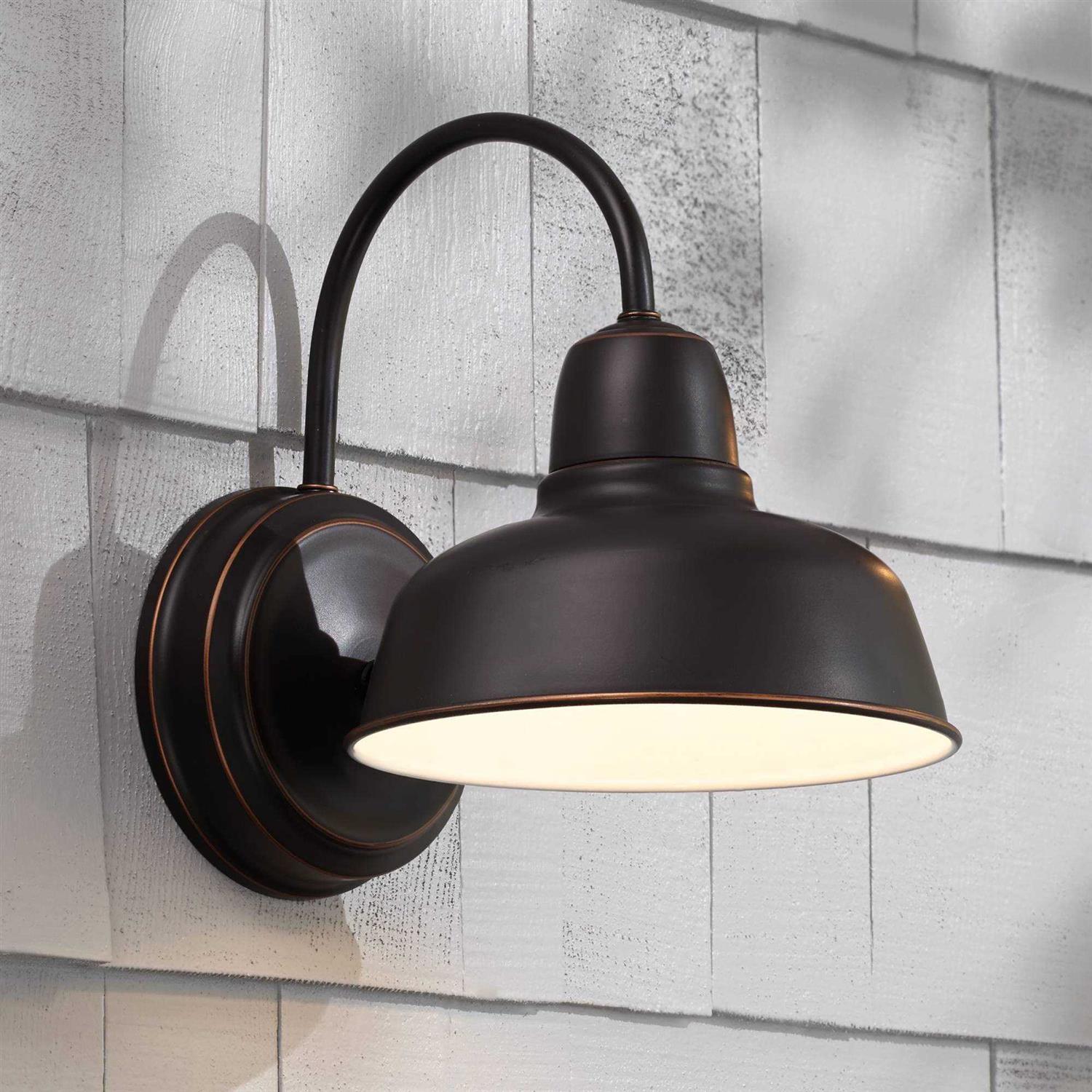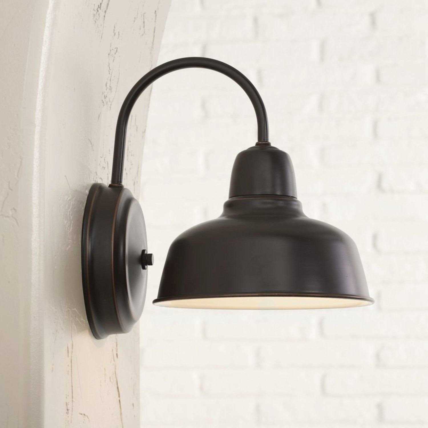 From the Urban Barn collection by John Timberland, this indoor-outdoor wall light comes in a charming industrial farmhouse style. The steel frame features a wide downlight shade attached to the end of a thin, arching gooseneck arm. An oil rubbed bronze finish adds a handsome rustic touch. Perfect for use in a porch or patio area. 11 1/4″ high x 8 1/2″ wide. Extends 10 1/2″ from wall. Weighs 1.54 lbs. Round backplate is 6 1/4″ wide. Shade is 8 1/2″ wide x 4 1/4″ high. Uses one maximum 100 watt standard-medium base bulb (not included). Gooseneck arm wall light inspired by industrial and farmhouse barn lights. From the Urban Barn collection by John Timberland. Oil-rubbed bronze finish. Steel construction. Can be used indoors or outside. Wet location outdoor rated.