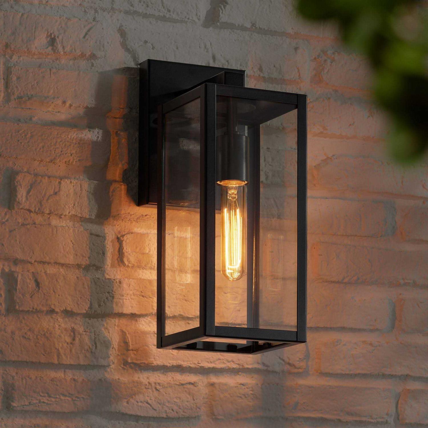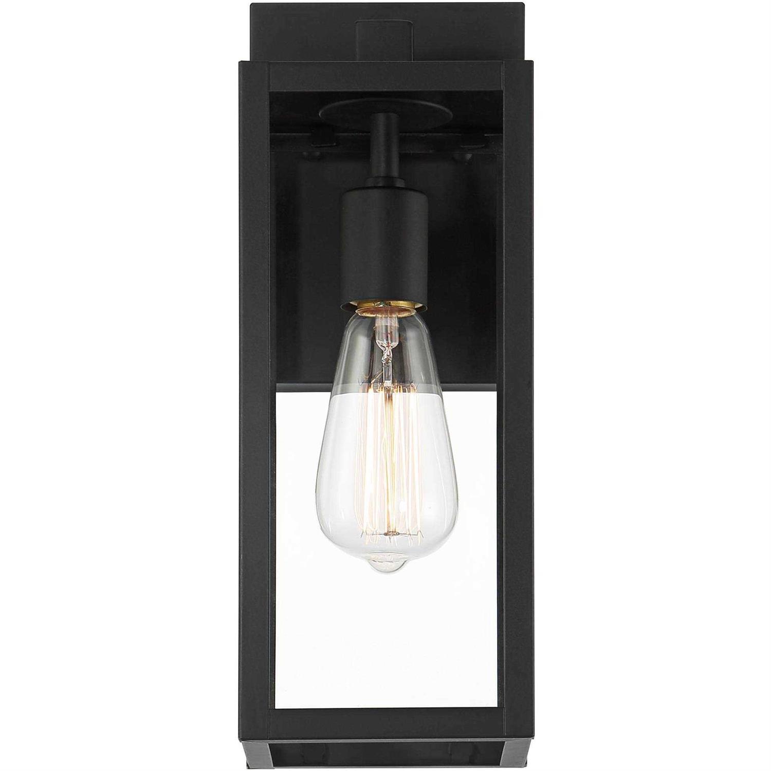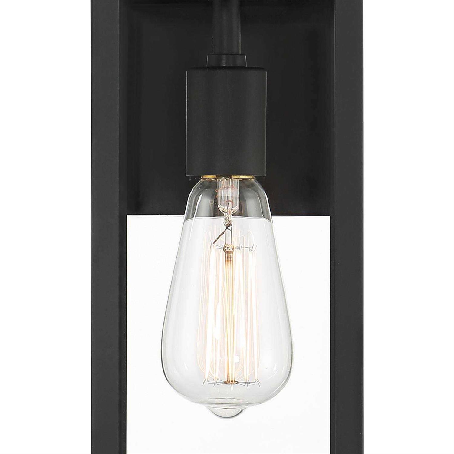 Each is 14 1/4″ high x 5″ wide. Extend 7″ from the wall. Backplate is 7″ high x 5″ wide. Center of mounting point to top of fixture is 3 1/4″. Weigh 4.6 lbs. UL listed. Each uses one maximum 60 watt standard-medium base bulb (not included). Shown with clear glass Edison filament bulbs. Set of two contemporary modern Titan outdoor wall lights. Clean, modern style, rectangular light profile. From the John Timberland brand. Clear glass panels allow bulbs to be seen. Open bottom. Mystic black finish. Metal construction. Wet location rated for outdoor use. Can only be mounted with bulb facing down. Like the classic tales of Greek mythology, the Titan collection of outdoor lighting fixtures is here to make a statement, albeit with a modern twist. Clean lines are embraced by the mystic black finish on this set of two outdoor wall lights, while clear glass panels showcase the fixture’s singular bulb. Contemporary design aesthetics create a definitive angular profile, creating a brilliant addition to your outdoor areas.