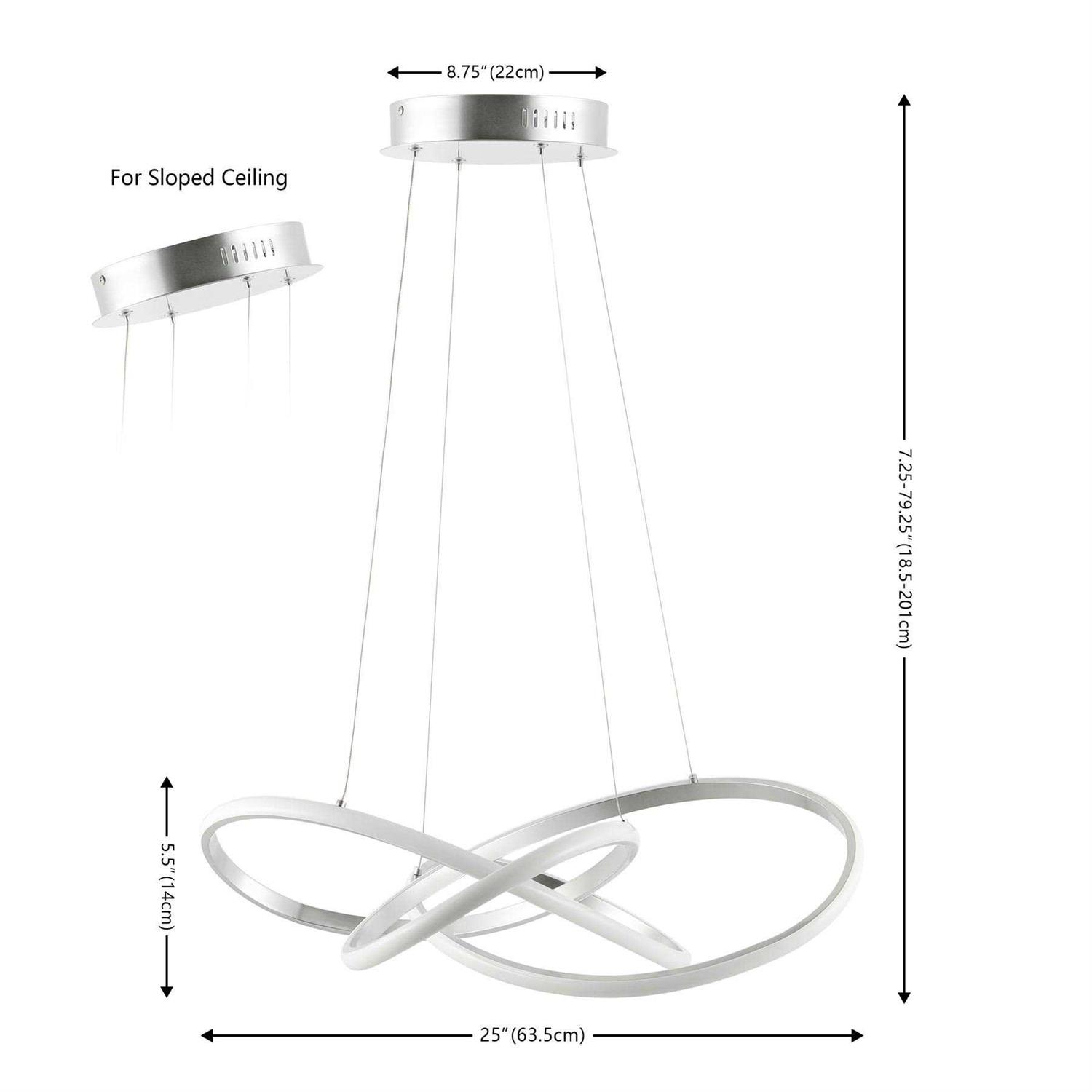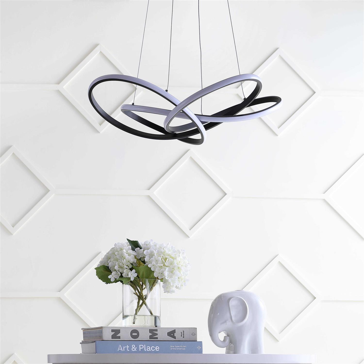 Intertwined curves of LED lights emitting from black iron create a look that is soft and elegant from materials traditionally known for their industrial strength. At 25 inch in diameter, it is stunning over a wood dining table, or incorporated as a way to soften industrial decor. With 36 watts of integrated LED lights, it is bright enough for a kitchen, but elegant enough for a living room, making it a versatile selection for anywhere in the home.