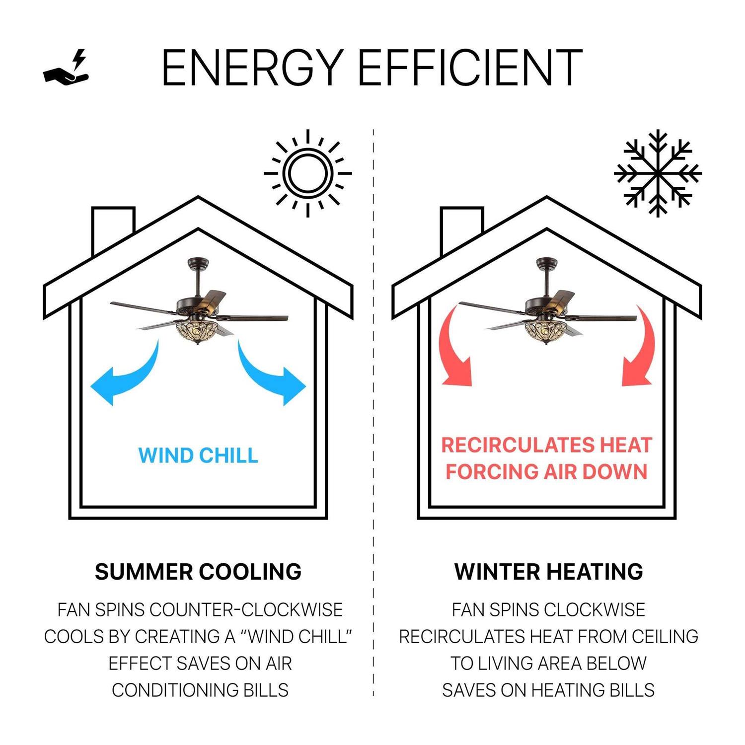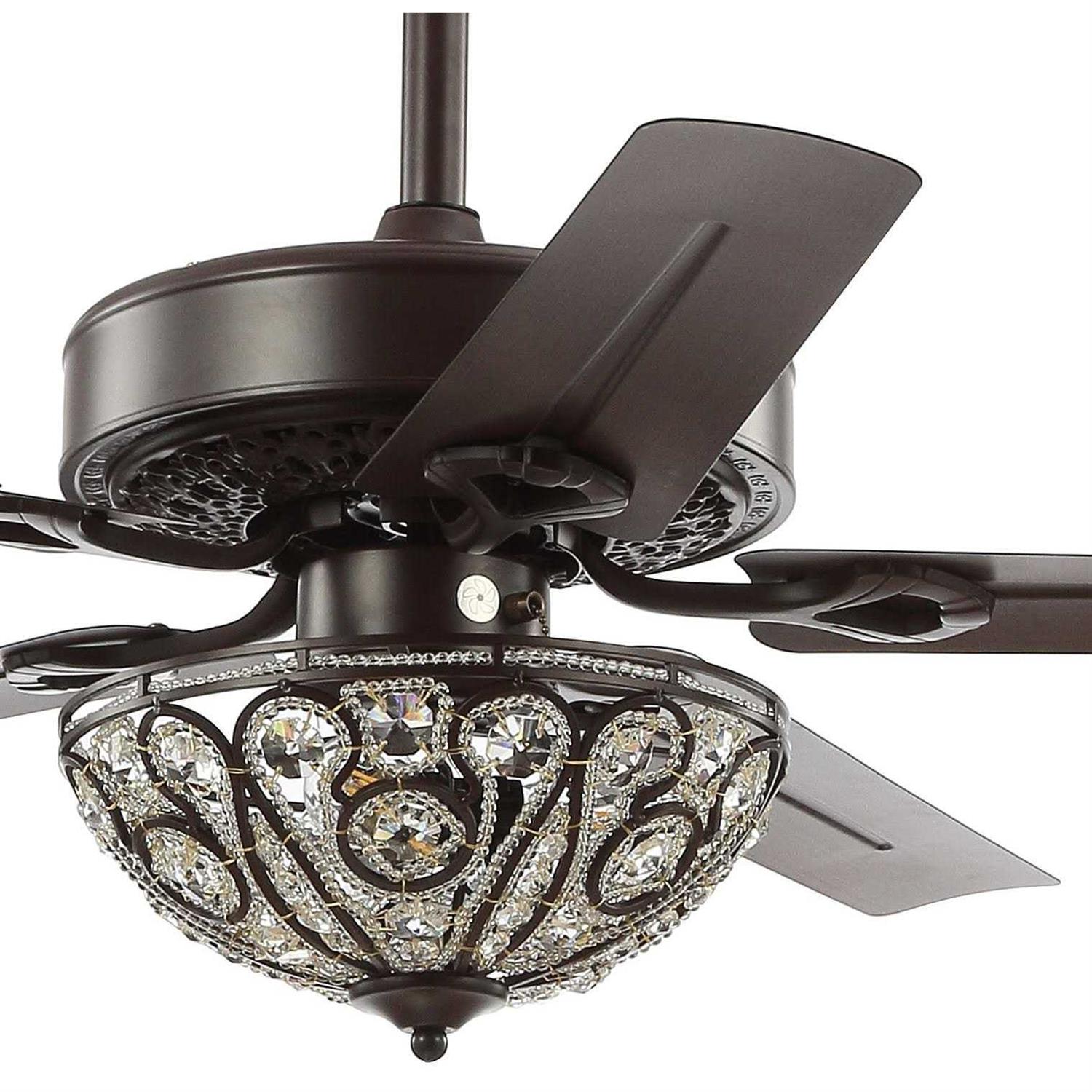 Our 52″ Oiled Bronze fan combines rustic style and Old World glamour, featuring an ornate wrought iron dome light embellished with crystal drops. Five reversible blades create plenty of air flow by remote control. Three Led bulbs provide bright, sparkling light.