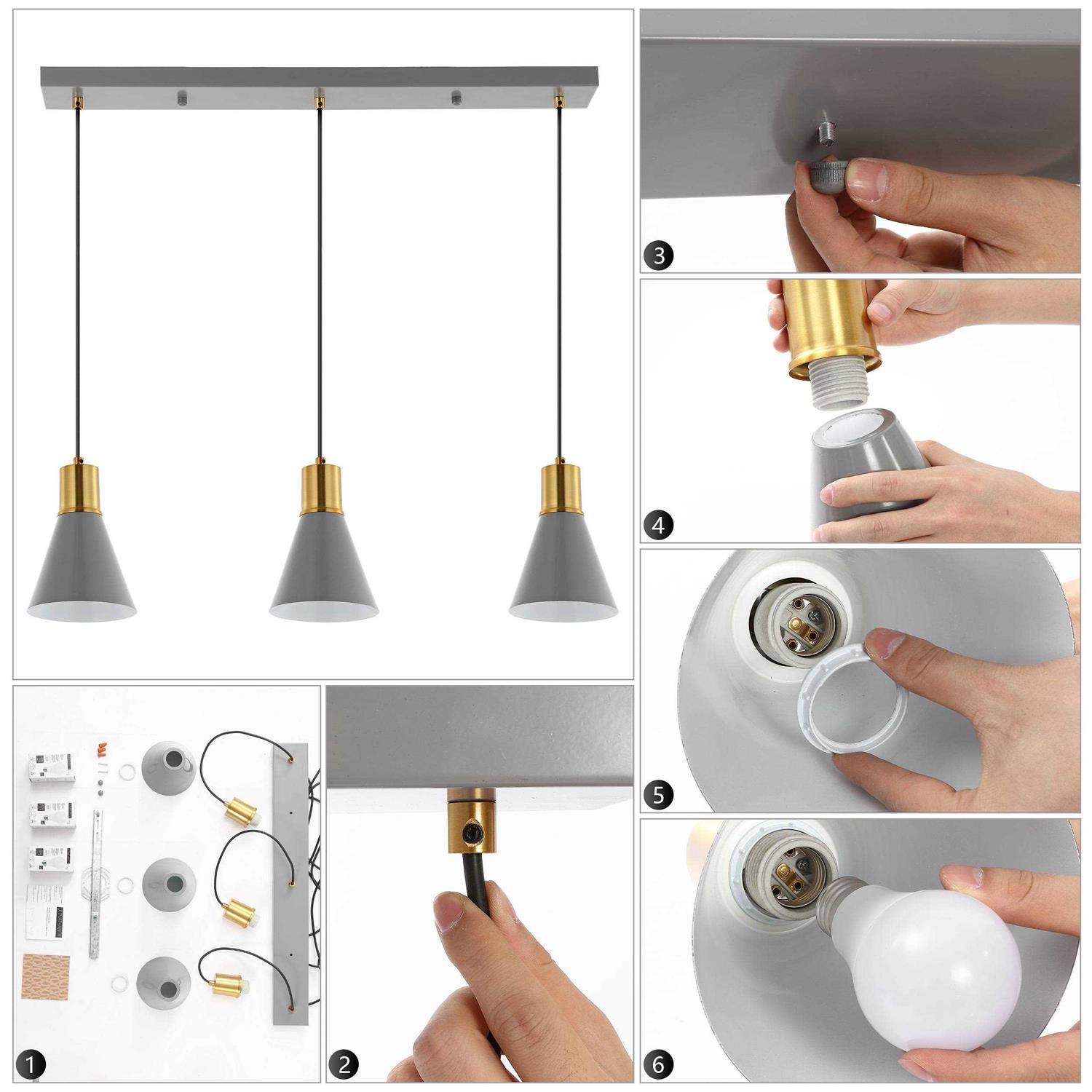 Cone shades with brass flutes hang in perfect harmony in this trio of pendants hanging from a single base. Adjustable in height, you can customize the drop to hang at the appropriate height whether over a kitchen island or in a formal dining room.