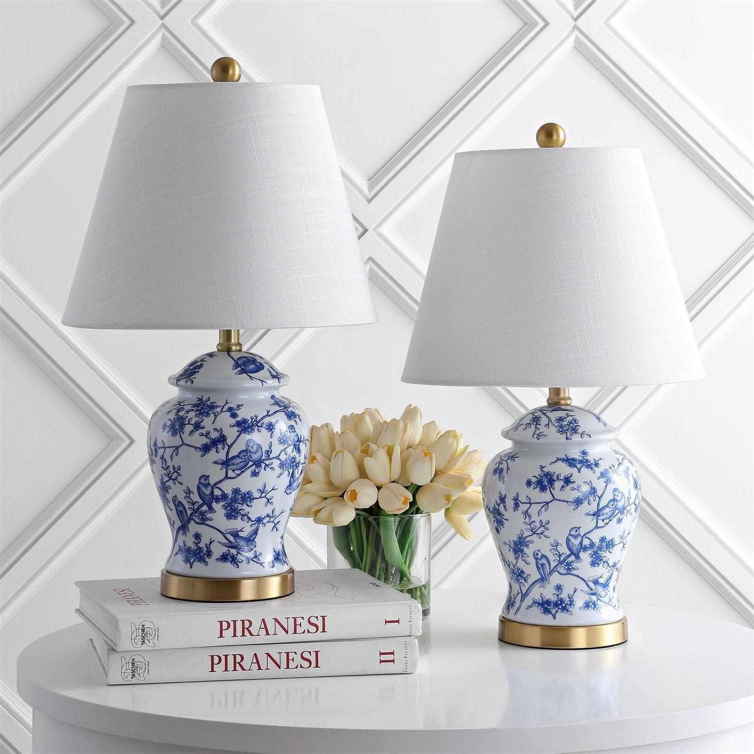 Add some elegant lighting in your home with this 22-inch Chinoiserie table lamp. This ginger jar lamp is hand-painted and glazed with antiqued brass ornamentation. The tapered linen hardback shade adds quiet grandeur to the traditional design. Finished with a brass finial on the top and a silk-wrapped cord in the back, it’s the perfect addition to your traditional space. Features: Hand-painted ginger jar lamp 100-percent cotton hardback tapered drum shade 60-inch silk cord with standard USA 2-prong plug On-off switch on socket Takes one maximum 60 watt or equivalent bulb (each)