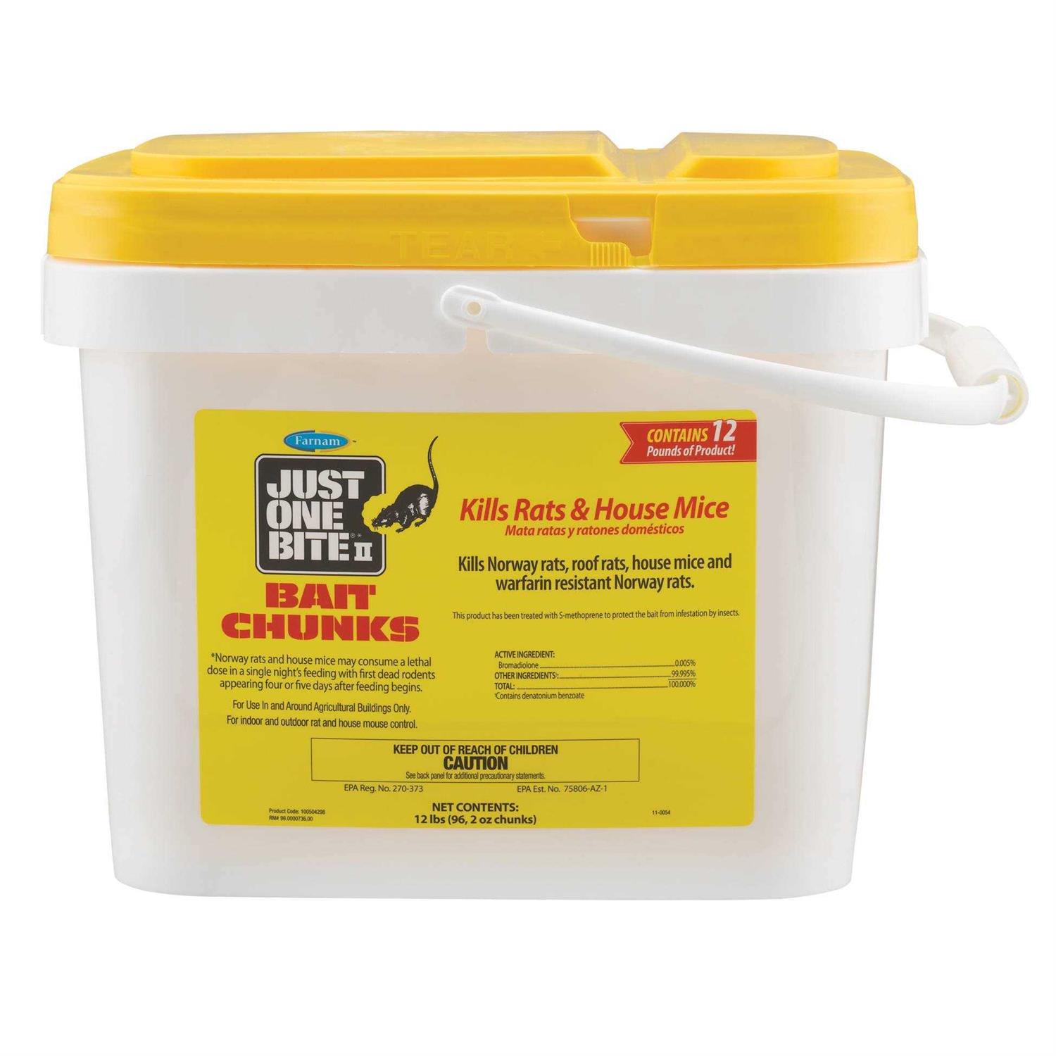 Just One Bite II kills mice roof rats and Norway rats. Norway rats and house mice may consume a lethal does in one feeding. The active ingredient is bromadilone a second-generation anti-coagulant rodenticide that causes internal bleeding. Also treated with methioprene to protect the bait from infestation by insects. Contains rodent’s favorite foods – grains and seeds. Death is delayed 4-5 days so there’s no bait shyness.