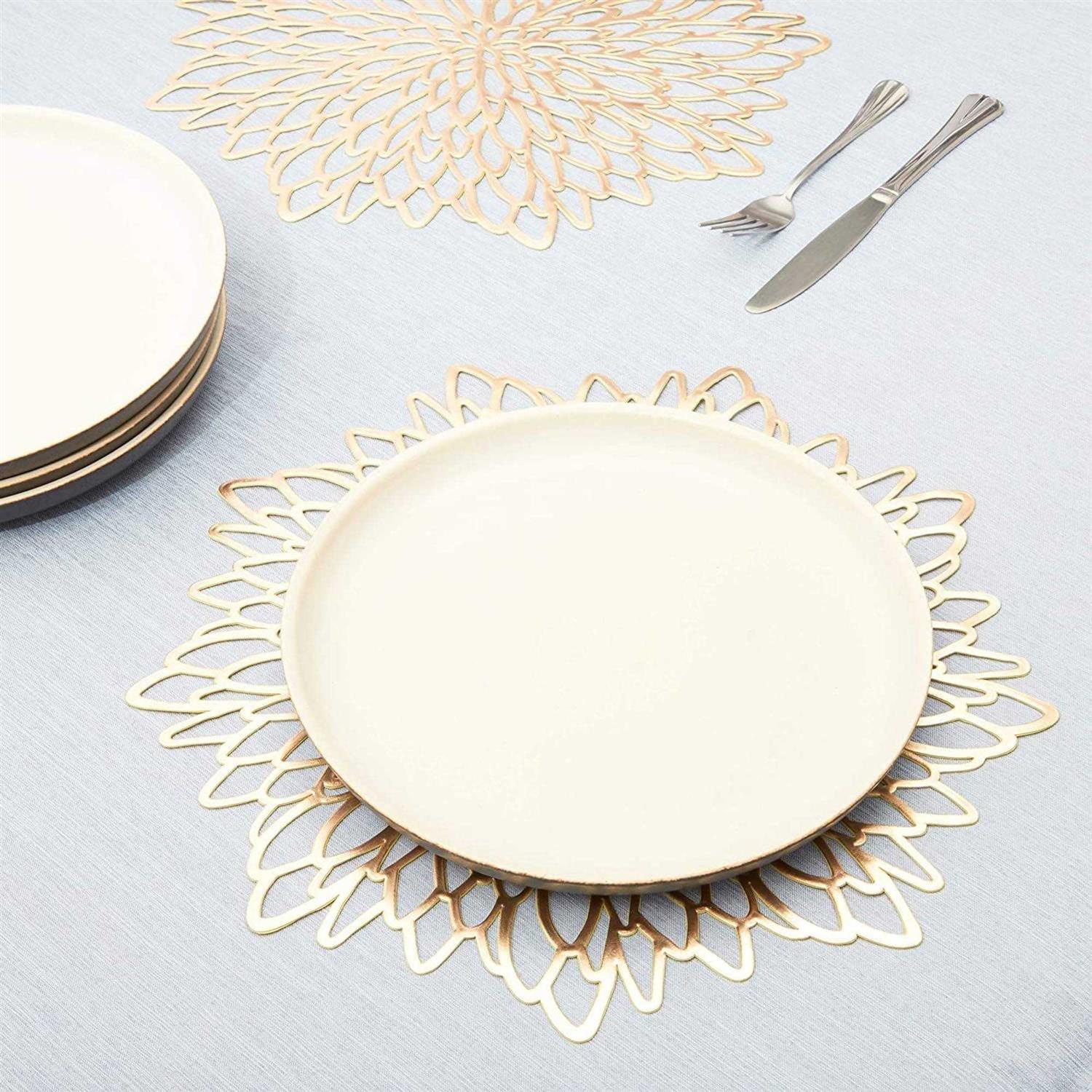 Item Description Elevate the table setting for any event or party with these decorative leaf design placemats. Made of premium quality vinyl, the gold placemats are a convenient and simple way to decorate your tabletops for an upcoming dinner party or event. These gold chargers are wipeable and washable and are perfect for wedding decorations. Juvale is a trademark or registered trademark of Juvo Plus, Inc. All other marks shown are owned by their respective owners.
