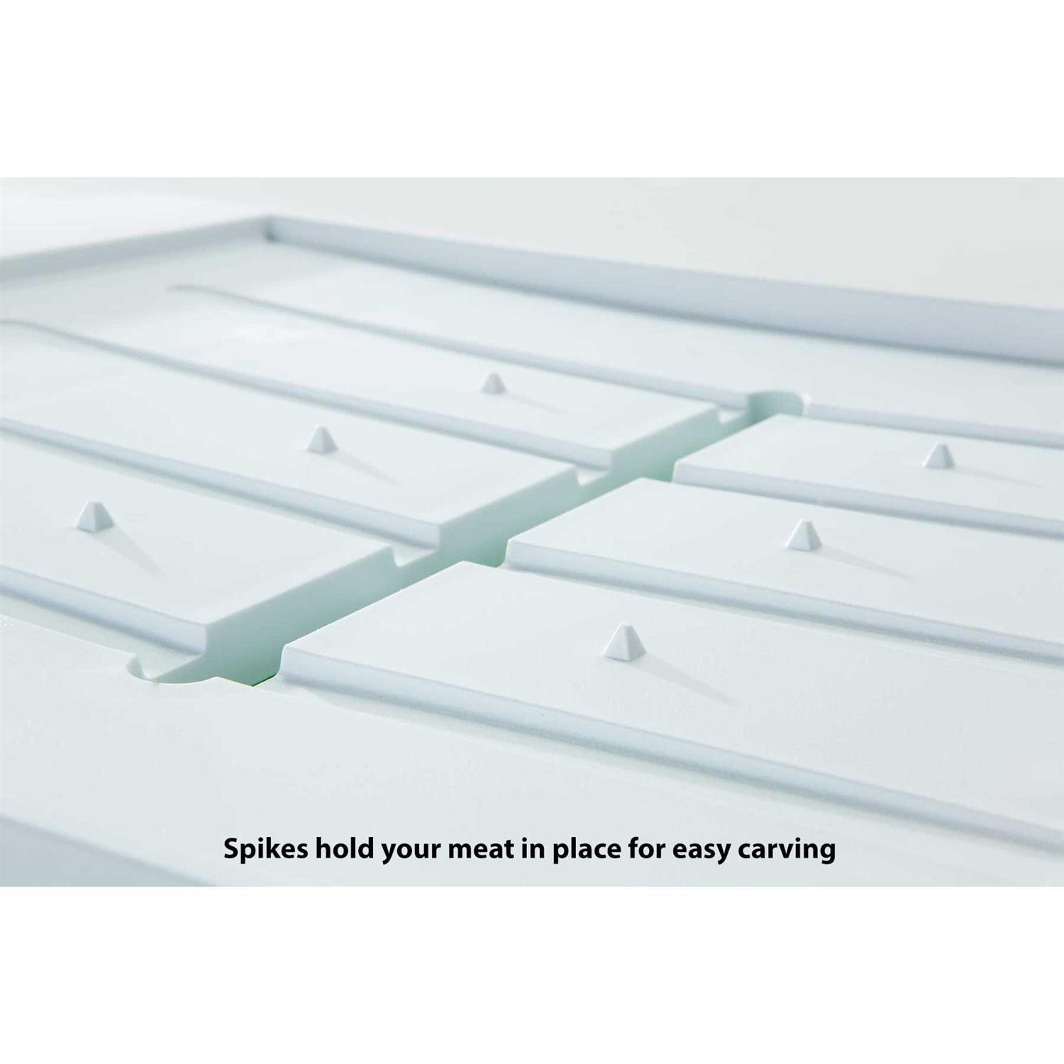 Finally, a no-mess carving solution from Karving King, the Dripless Cutting Board 2 in 1 System. It has a large capacity cutting area that not only reduces the mess but also eliminates the stress when carving everything from turkeys and roasts to fruits and vegetables. The unique patented design of the Karving King Dripless Cutting Board 2 in 1 System allows for liquids and juices to drain away from the carving surface and be collected in the drip tray for use in making gravies and sauces instead of on kitchen countertops and floors. Created for but not limited to the home cook, the Karving King Dripless Cutting Board 2 in 1 System is made of a durable, lightweight polyethylene that is non-porous, odor resistant and dishwasher safe which reduces the risk of cross-contamination during food preparation. The American made Dripless Cutting Board from Karving King features spikes to hold the food in place during carving, easy grip rubber feet and a removable drip drawer that can also be used to store cutlery, making this the last cutting board a cook will ever need to buy.