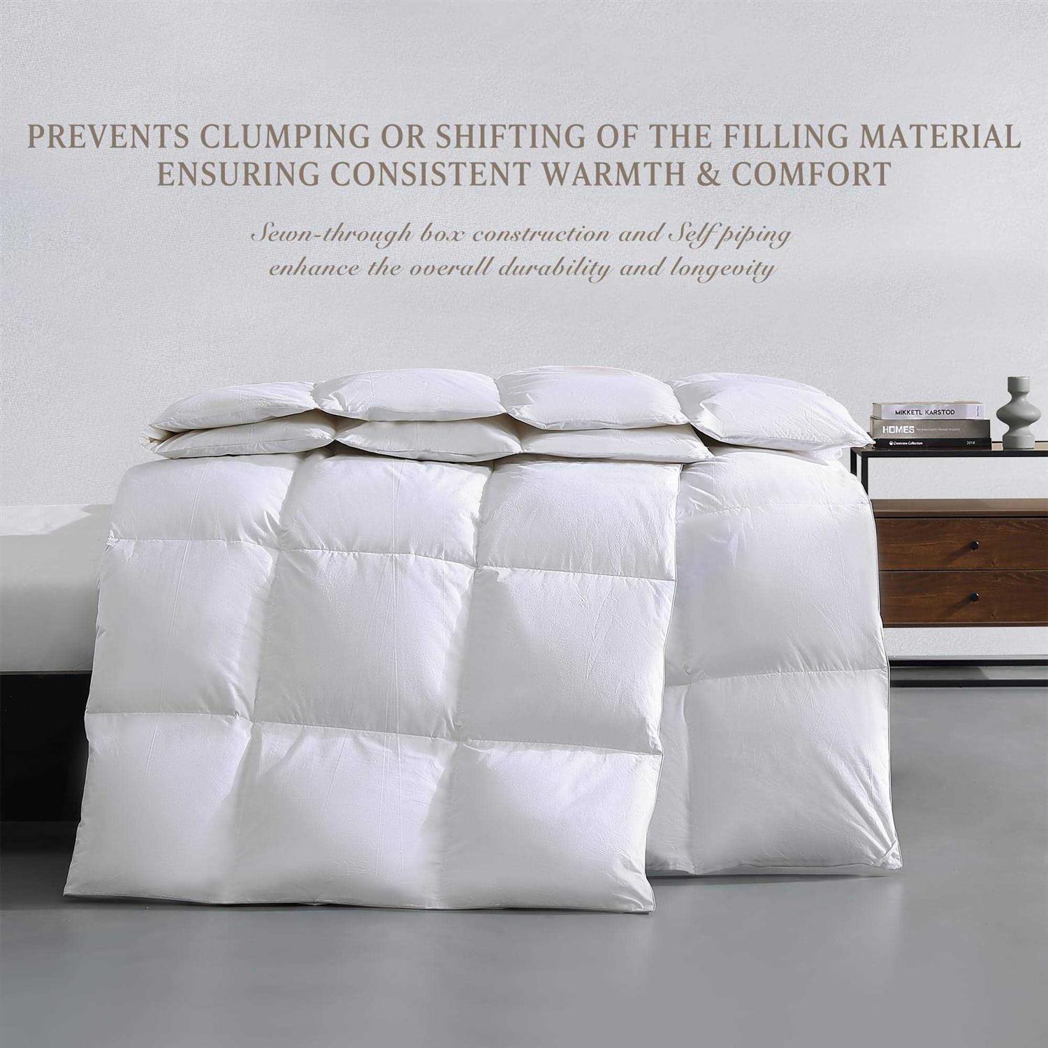 Comfort done right. Breath easy with this Kathy Ireland cozy feather and down blended comforter is filled with 90% White Goose Feathers and 10% White Goose Down. And it is hypoallergenic. Featuring 240 thread count cotton solid cover 14 inch end to end sewn through box construction with double stitched self piping making for lofty fill for a great night’s sleep. Wide is measured 68 inch and length 88 inch.
