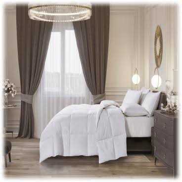 Comfort done right. Breath easy with this Kathy Ireland cozy feather and down blended comforter is filled with 90% White Goose Feathers and 10% White Goose Down. And it is hypoallergenic. Featuring 240 thread count cotton solid cover 14 inch end to end sewn through box construction with double stitched self piping making for lofty fill for a great night’s sleep. Wide is measured 104 inch and length 88 inch.