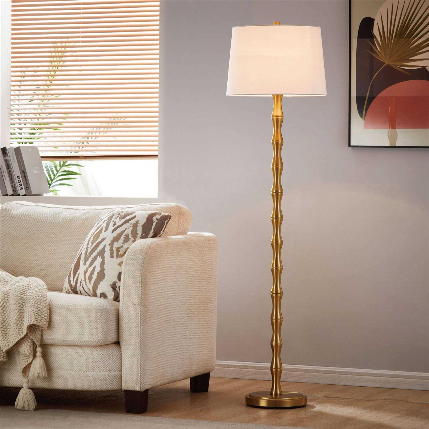With gentle curves and an antique gold-finished base, this floor lamp is perfect for lighting your living room, den, bedroom or office with a touch of glam. A weighted base is included for safety and wobble prevention. It is a perfect statement to blend well with modern, contemporary or glamorous aesthetics.