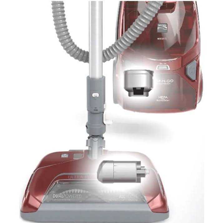 Keep your whole home clean and tidy with the Kenmore BC4027 Bagged Canister Vacuum, Red. It features a 2-motor system and HEPA filtration to capture even tiny particles of dust and other allergens. Choose from four height positions and even turn the brushrolls off to go from carpets to hard floors. Ultra Plush vents achieve a deep clean even on thick, soft carpet. With a hose that swivels 360 degrees and a telescoping wand, you get a long reach for cleaning ceiling fans and the tops of cabinets. This bagged canister vacuum cleaner is also lightweight and portable for working on stairs. The head swivels to navigate around and beneath furniture and has a headlight for revealing the dirt in its path.