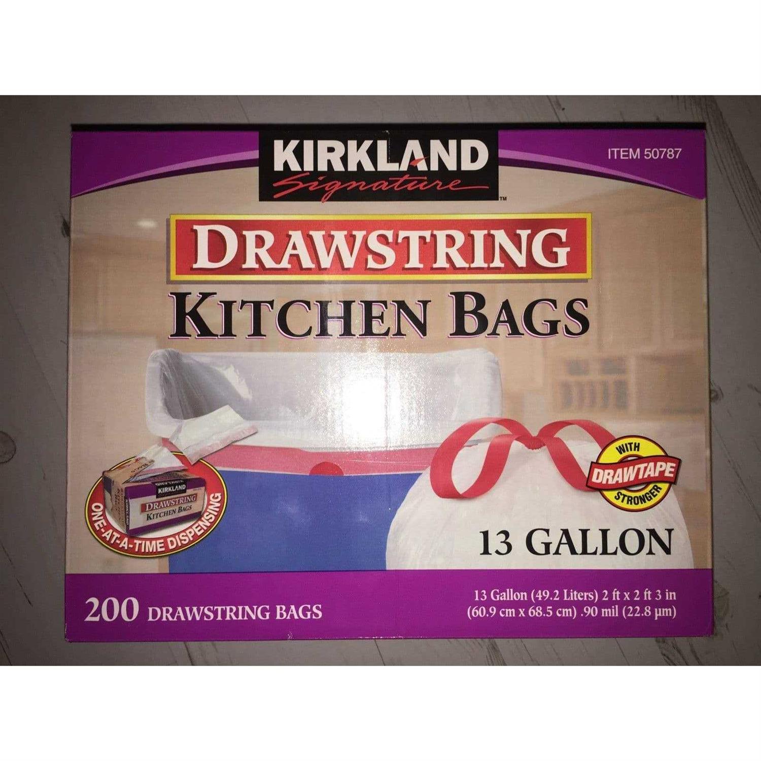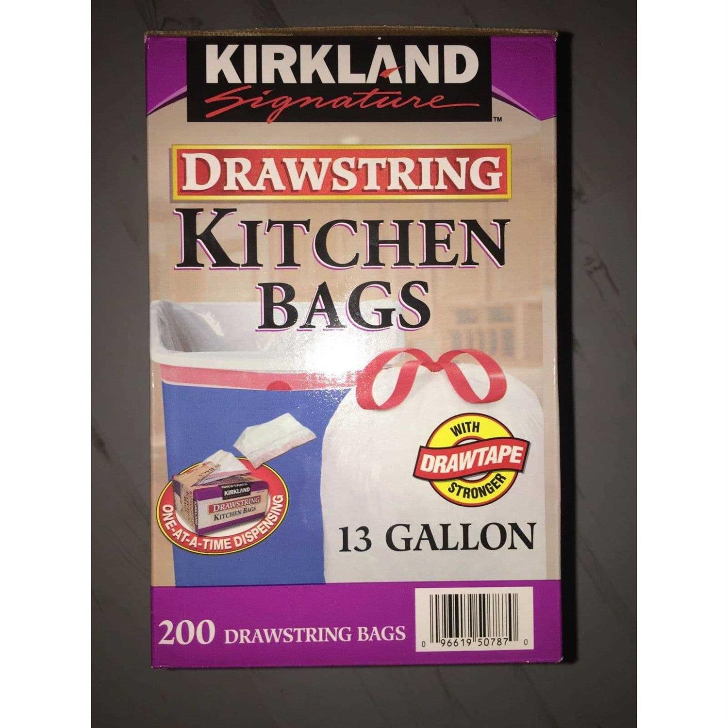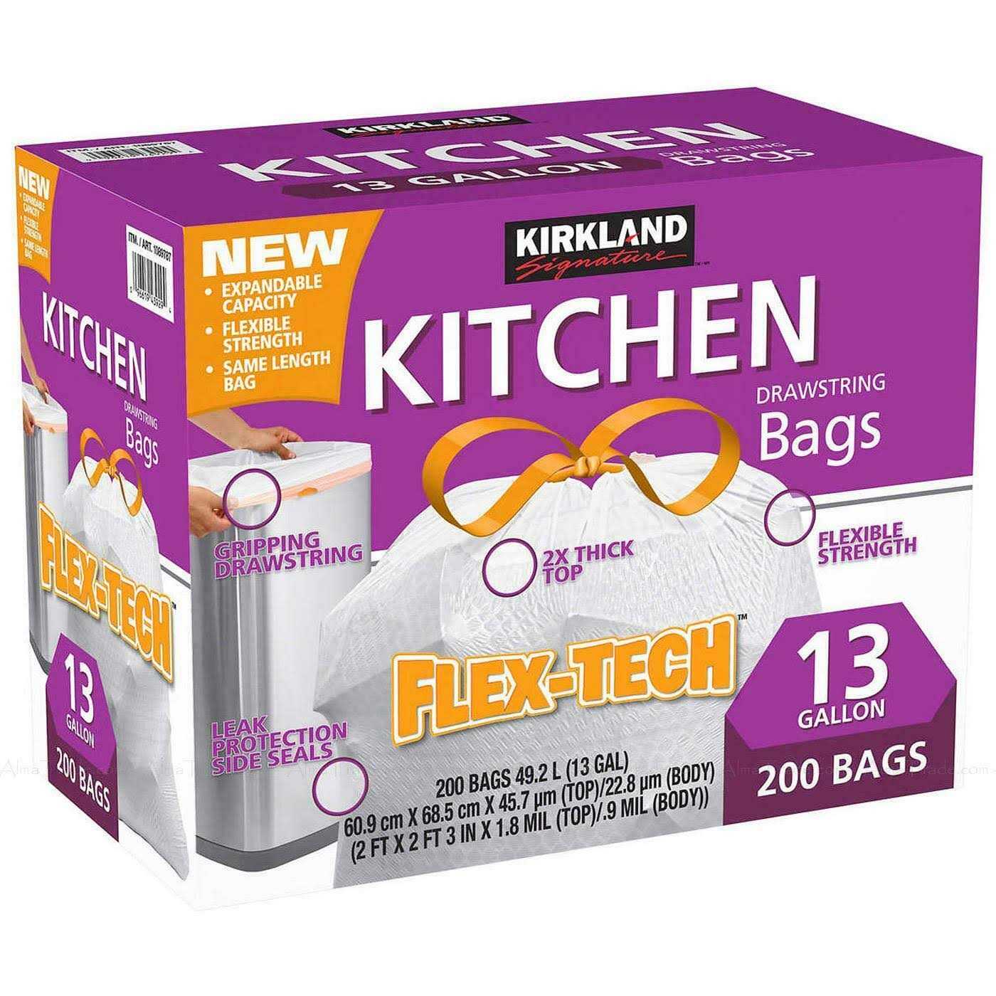 200 Flex-Tech Bags 13-gallon Flex-Tech kitchen bags are reinforced at the top. Flex-Tech plastic incorporated into the product allows the new Kirkland Signature kitchen bag to expand around your trash, reducing tears and increasing holding capacity. The bag’s gripping drawstring expands around trash cans and then contracts to keep the bag on the can, not in it.