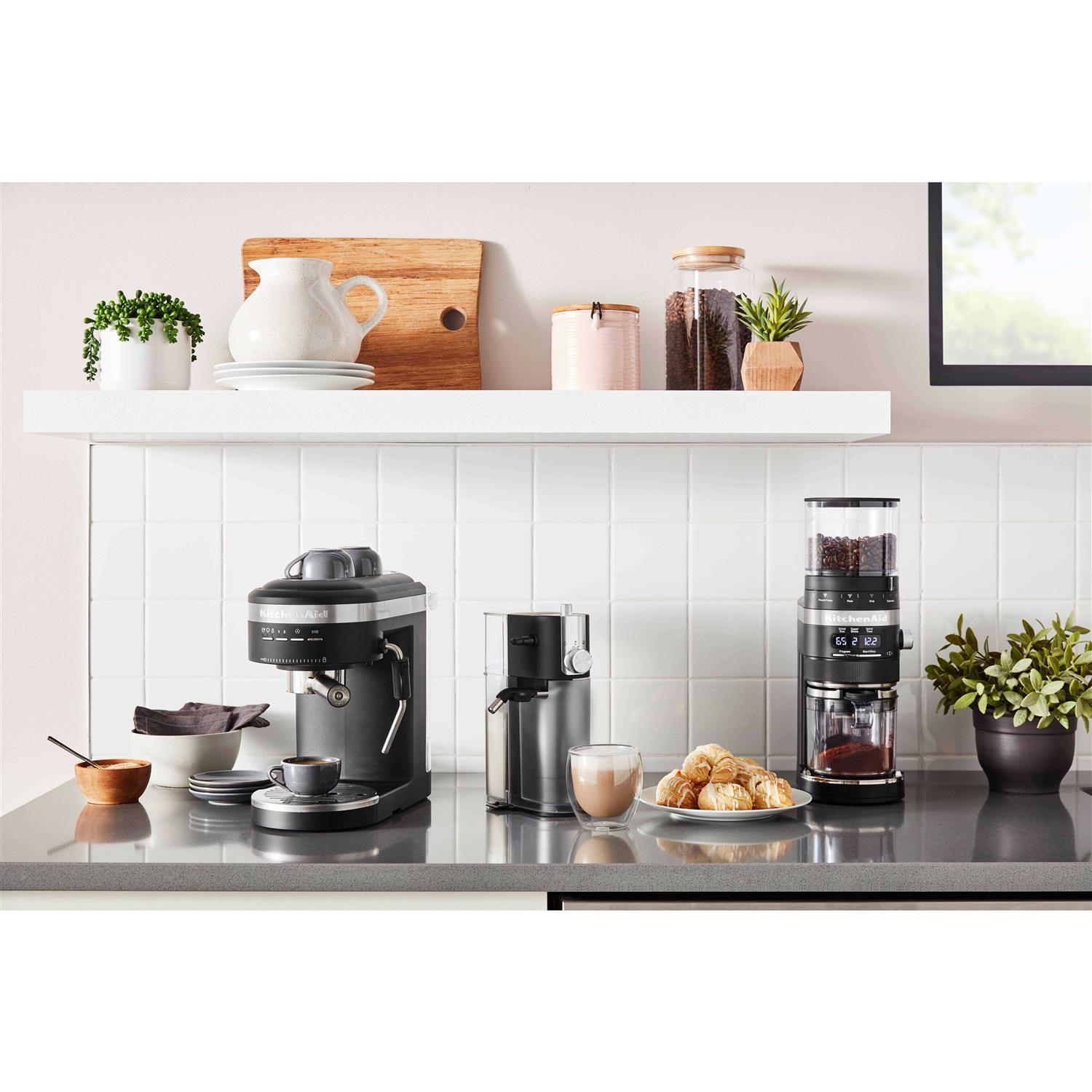 Prepare milk for delicious lattes and cappuccinos with KitchenAid’s automatic milk frother attachment. Designed to attach to the KitchenAid Semi-Automatic Espresso Machine (sold separately), the frother features programmable dosing and a variable micro-foam adjuster that allows you to adjust the milk amount and texture to match your preference. Model #KESMK4.