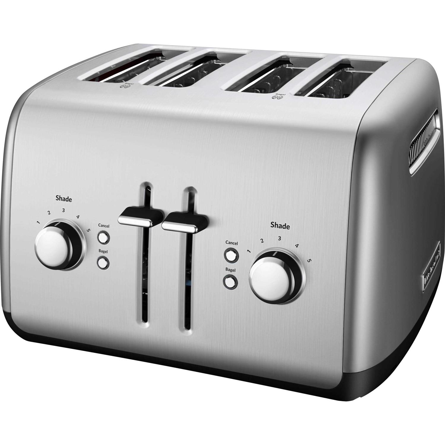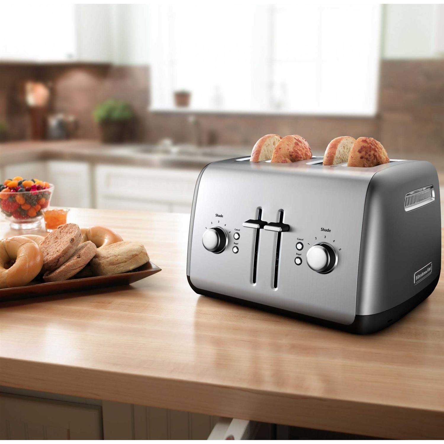 An attractive and functional addition to any countertop, the KitchenAid 4-Slice Toaster offers a variety of functions for everyday use. Toast bread to your desired shade, precisely toast the cut sides of bagels, defrost and toast frozen food or reheat previously toasted food in under a minute. Plus, a high lift lever makes it easy to remove whatever you’re toasting.