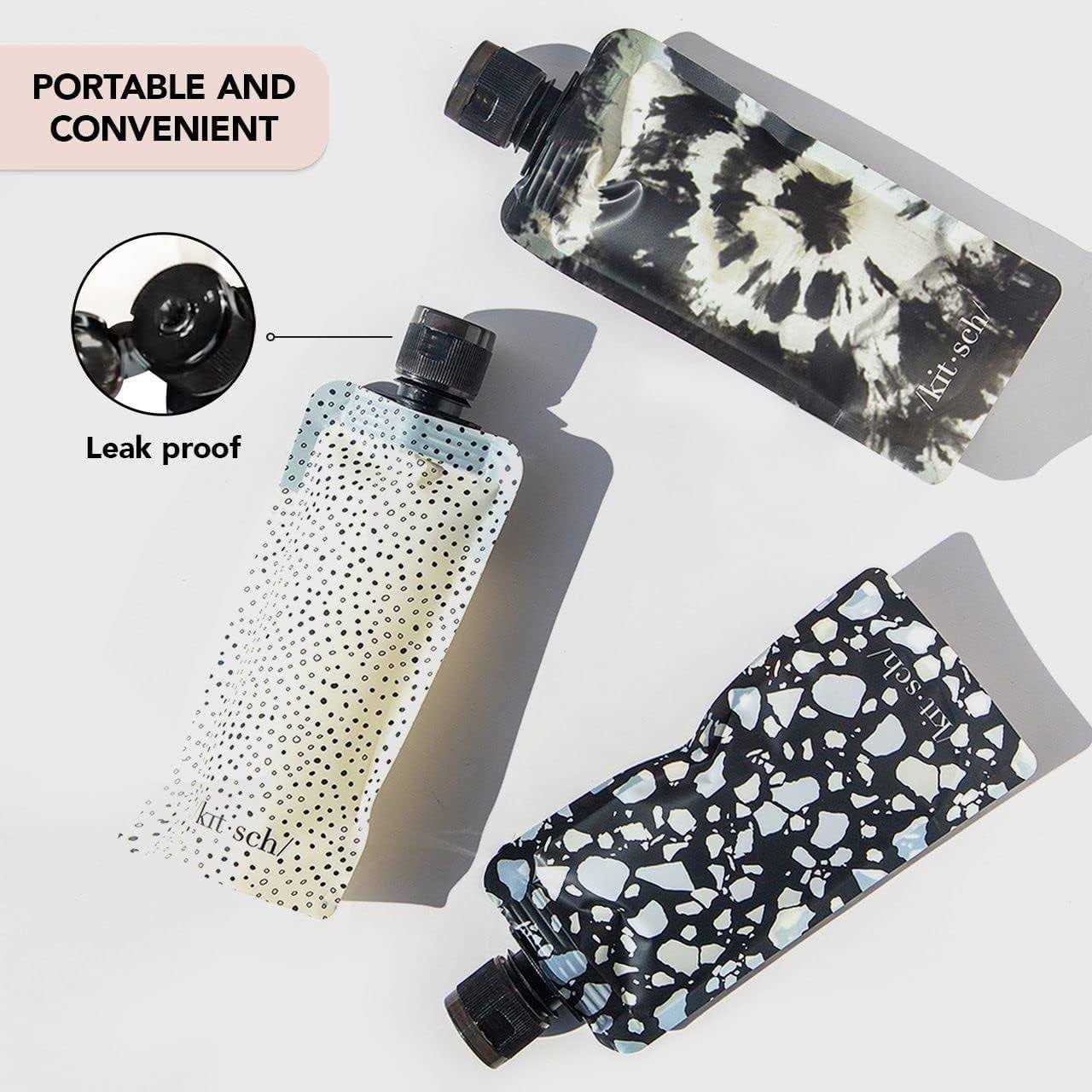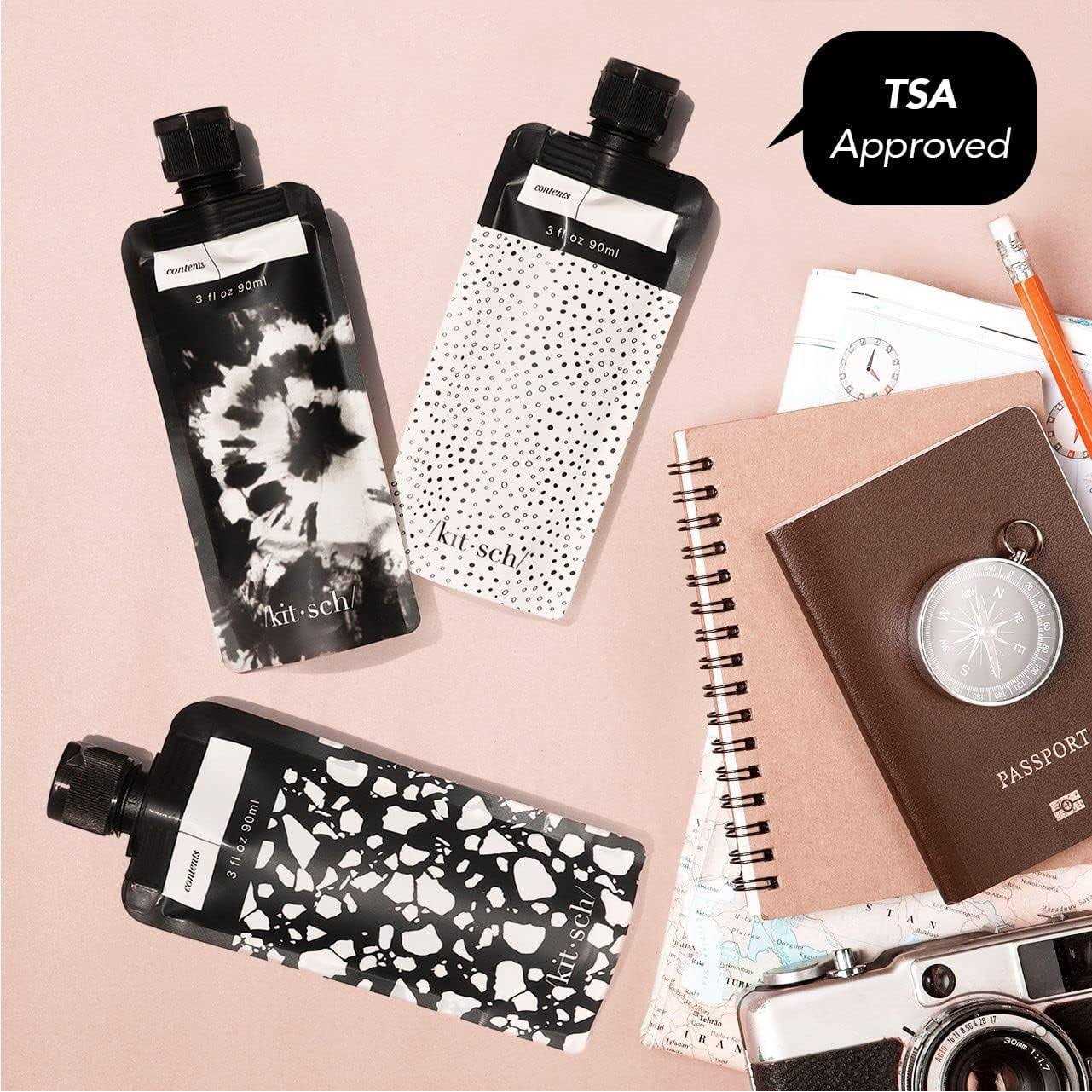 Kitsch Refillable Travel Pouches were created for your elevated getaway. Includes 3 flat pouch bottles with marble patterns uniquely designed in beautiful Black and Ivory. Made compact and lightweight for easy packing into your purse, carry-on or suitcase. Pouches are reusable, leak-proof, durable and dishwasher safe. Kitsch travel sets are TSA APPROVED, so you dont have to worry about getting your beauty supplies on your next flight. All ECO-FRIENDLY, Kitsch pouches are made of high quality materials, including BPA FREE plastic. Kitsch travel pouches were carefully designed to meet the diverse needs and are ideal for carry-ons and suitcases to take on flights, cruises, camping trips, picnics, the beach, to the gym, work and anywhere else where you travel on the go. Upgrade your travel game with Kitsch Refillable Travel Pouches! 0.08 oz.
